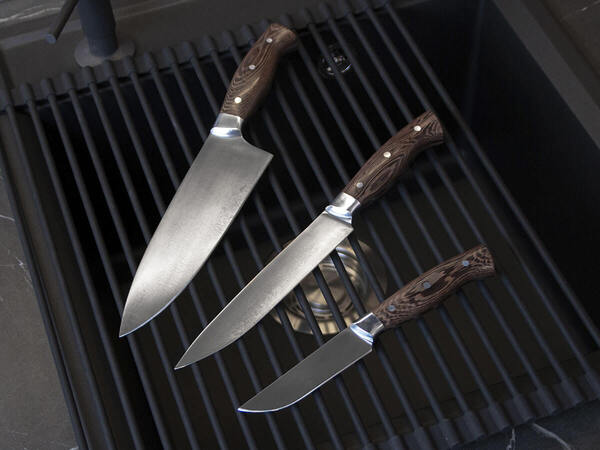 Клинки ножей выполнены из высокоуглеродистой кованой стали Х12МФ, что гарантирует отличный рез при высоких и длительных нагрузках. Х12МФ – прочная и износостойкая сталь. Клинки из такой стали долго держат заточку, поэтому ее широко используют в изготовлении охотничьих и кухонных ножей.