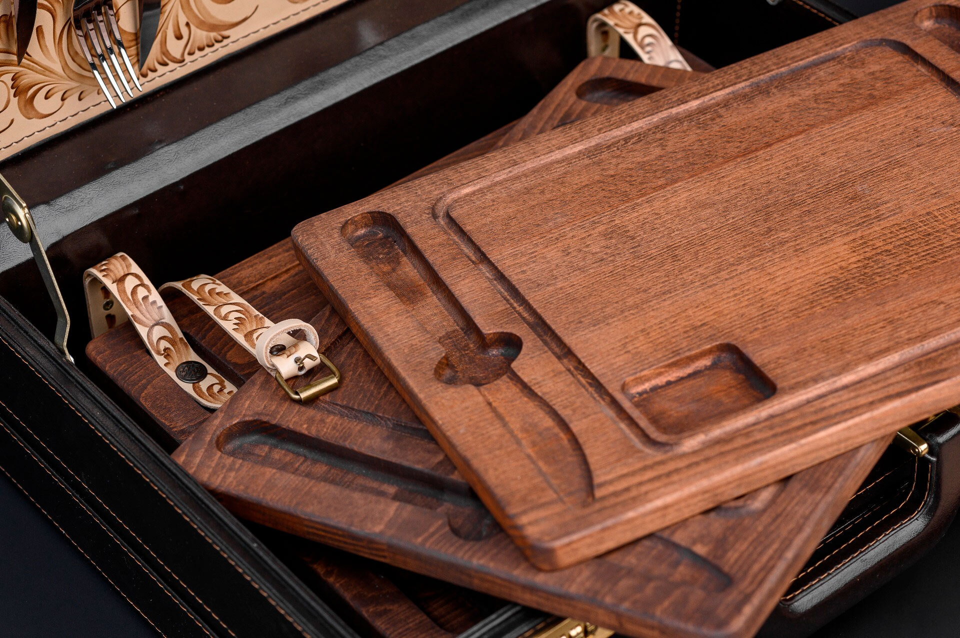 К каждой доске прилагаются нож и вилка. Приборы изготовлены из высококачественной нержавеющей стали и дополнены рукоятями из венге — прочной древесины с глубоким тёмным оттенком.
