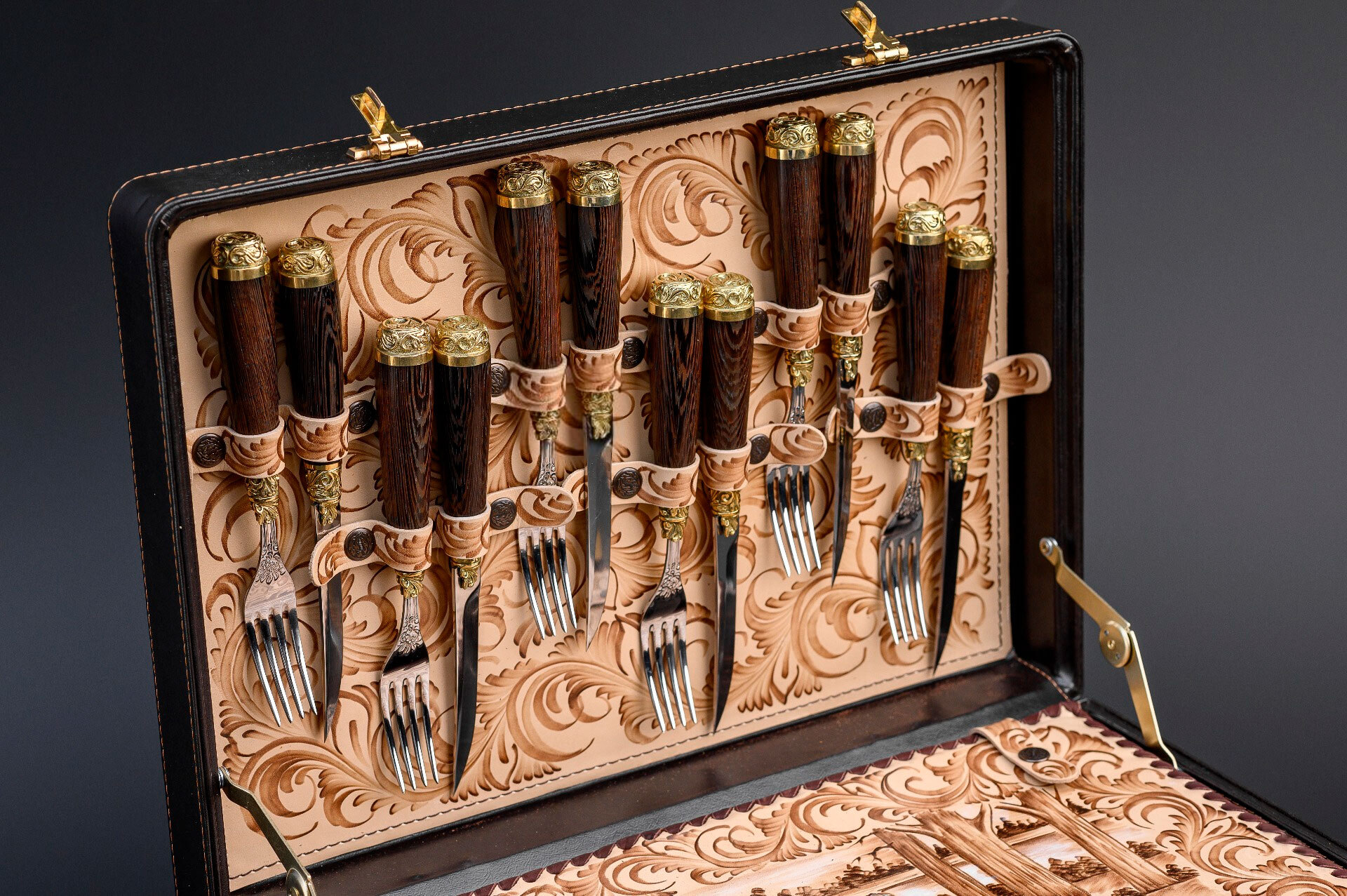 Особую выразительность набору придают латунные декоративные элементы, выполненные методом художественного литья. Они подчеркивают характер комплекта и создают ощущение премиального авторского изделия.