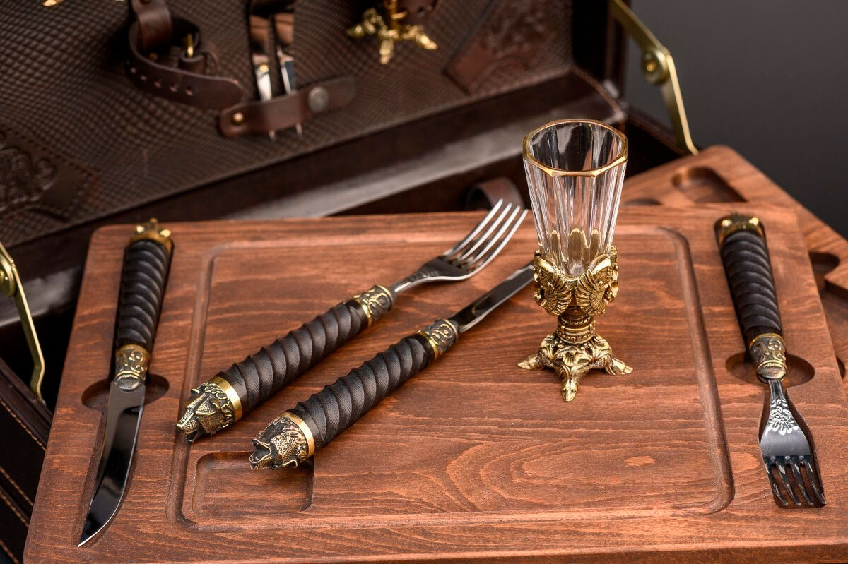 К каждой доске прилагаются нож и вилка. Приборы выполнены из нержавеющей стали и дополнены рукоятями из древесины граба — плотного и прочного материала, который примерно на 30% плотнее дуба. Особый акцент приборов — элементы художественного литья из латуни. Навершия в виде голов диких животных придают приборам выразительный характер и делают набор по-настоящему запоминающимся.