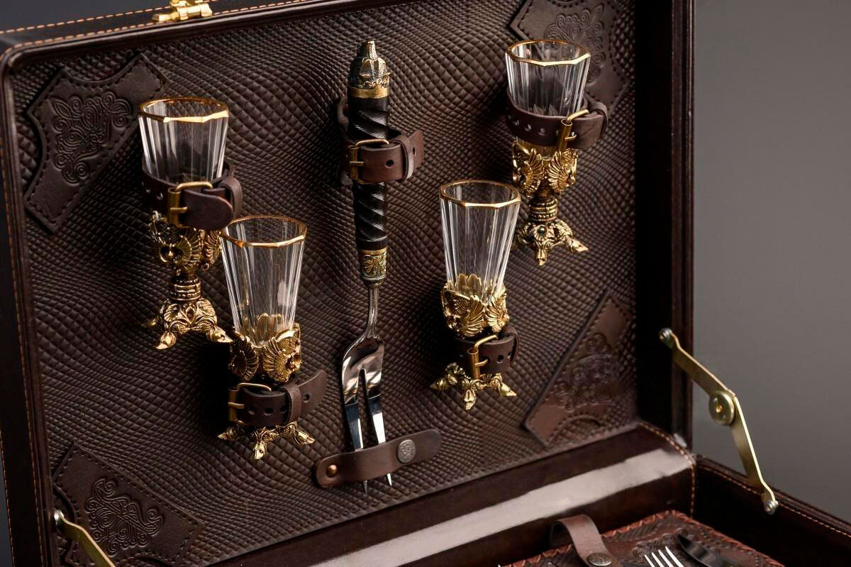 Каждая рюмка украшена декоративным элементом из патинированной латуни, выполненным методом художественного литья. Такое сочетание создаёт атмосферу старых русских традиций и добавляет особое настроение к мясному ужину.