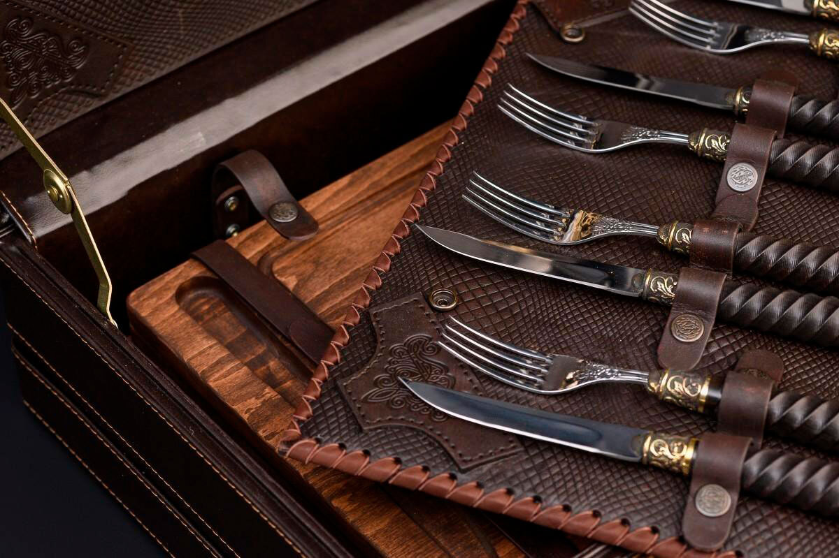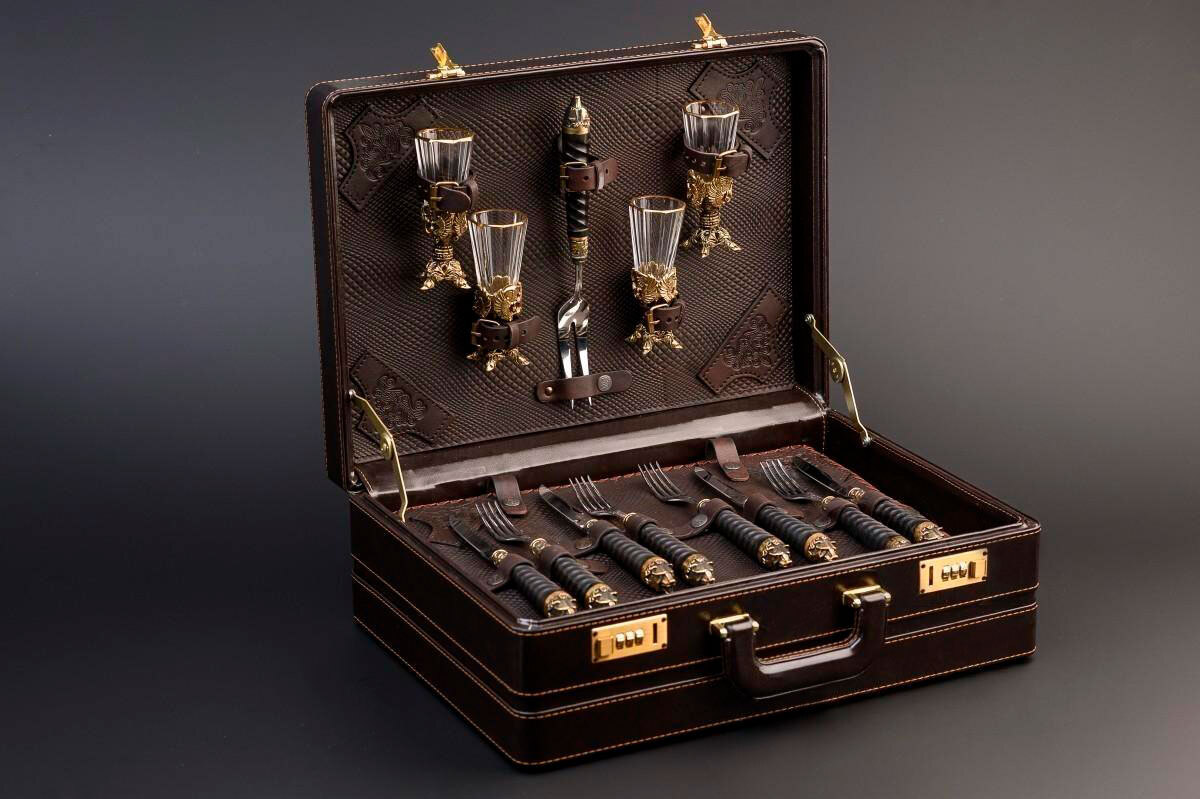 Внутренняя часть отделана натуральной тиснёной кожей, а продуманное расположение предметов позволяет удобно хранить и транспортировать комплект. Такой кейс выглядит презентабельно и делает набор отличным подарком.