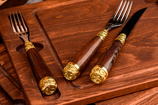 К каждой доске прилагаются нож и вилка. Приборы изготовлены из высококачественной нержавеющей стали и дополнены рукоятями из венге – прочной древесины с глубоким благородным оттенком.