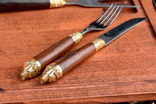 К каждой доске прилагаются нож и вилка. Приборы выполнены из нержавеющей стали и дополнены рукоятями из венге – прочной древесины с глубоким благородным оттенком.
