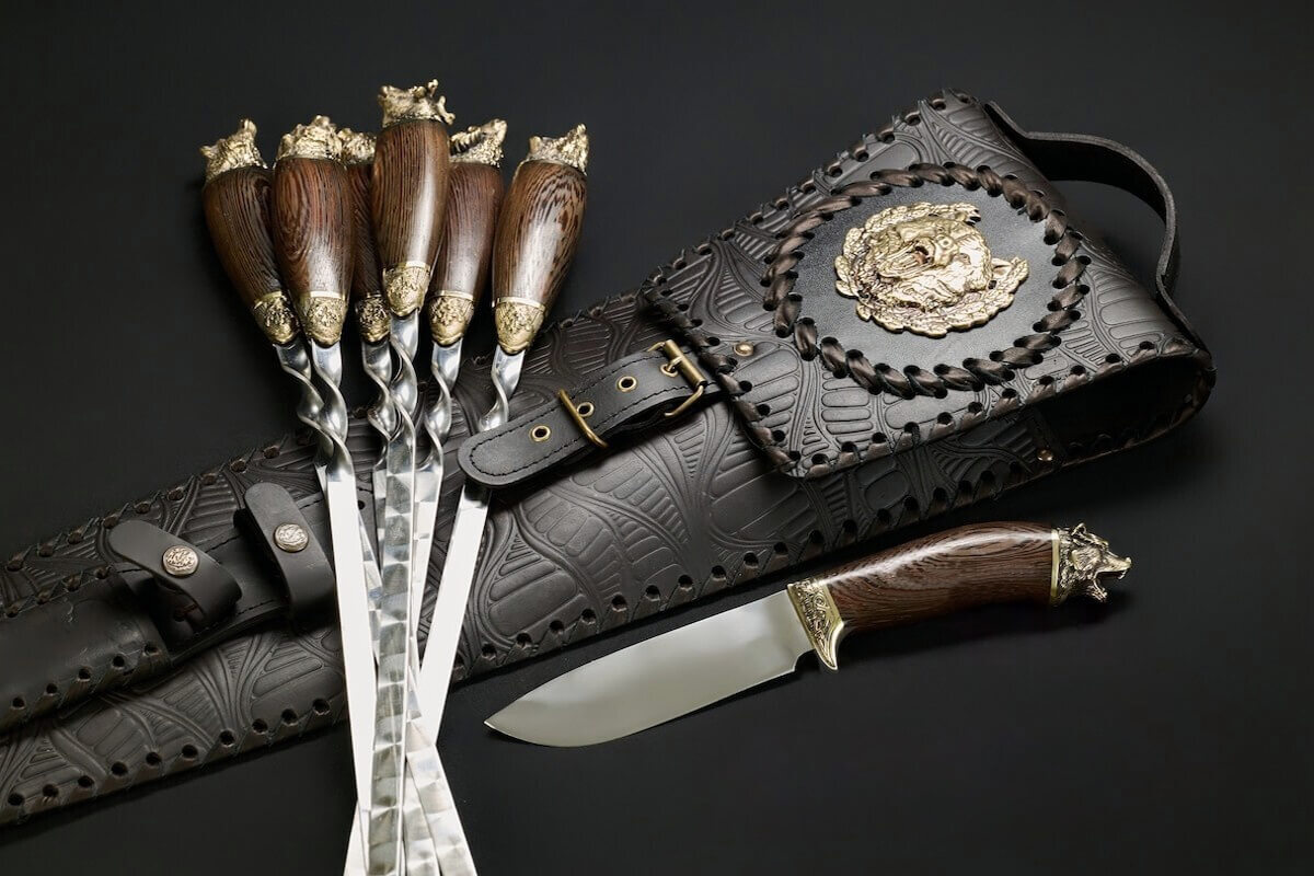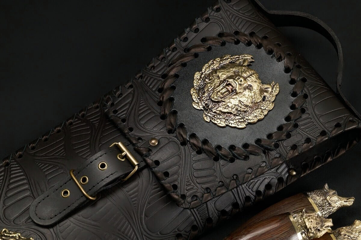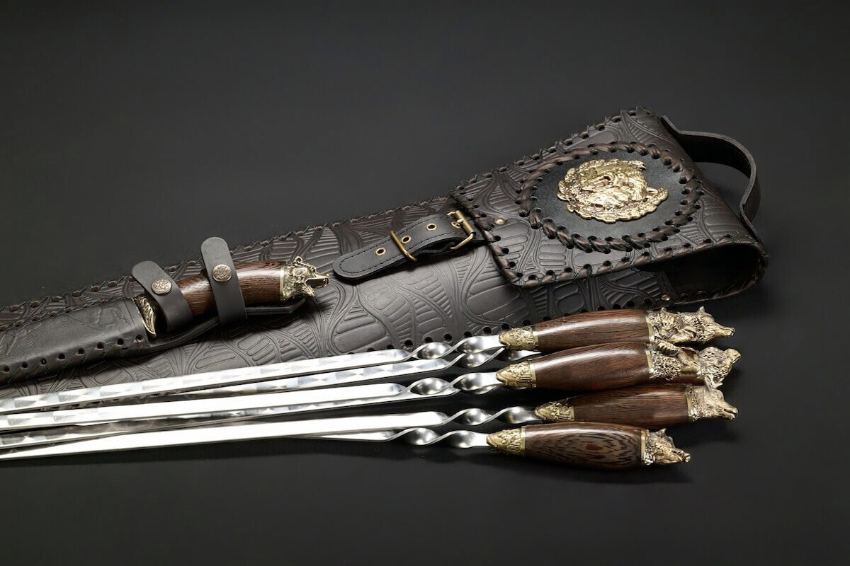 Чехол для шампуров выполнен из натуральной кожи, удобный в использовании, имеет ручку для переноски. На кожу прикреплен эмблема, выполненная вручную. Все материалы качественные и прослужат Вам долгие годы.