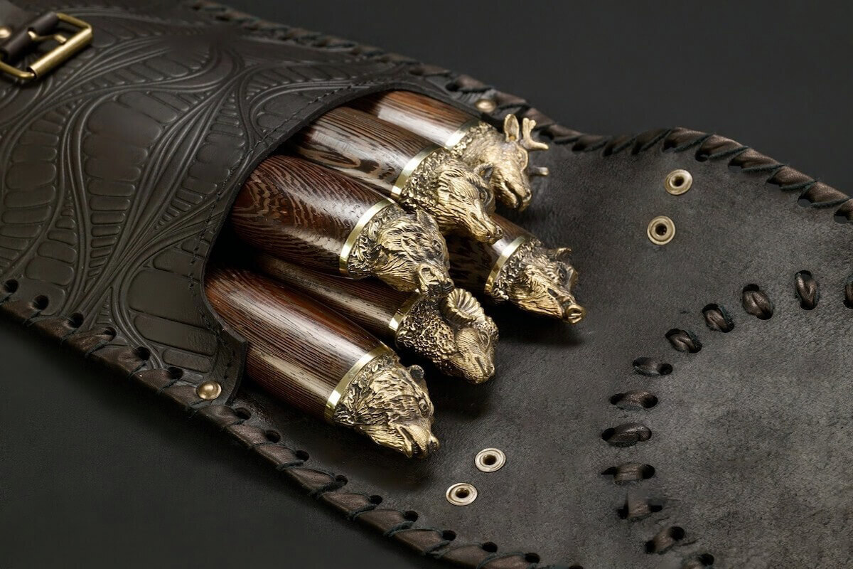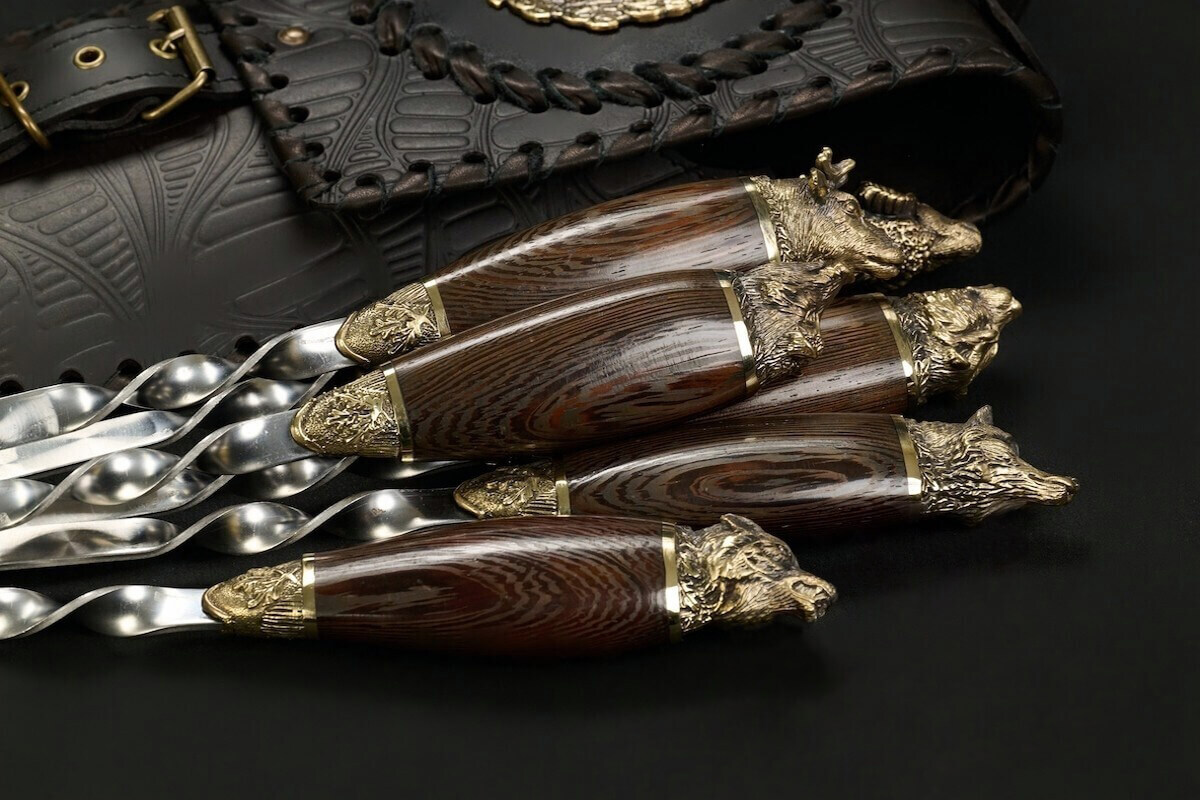 В данном комплекте шампуров представлены головы следующих зверей: Медведь, Кабан, Олень, Собака, Волк, Баран.