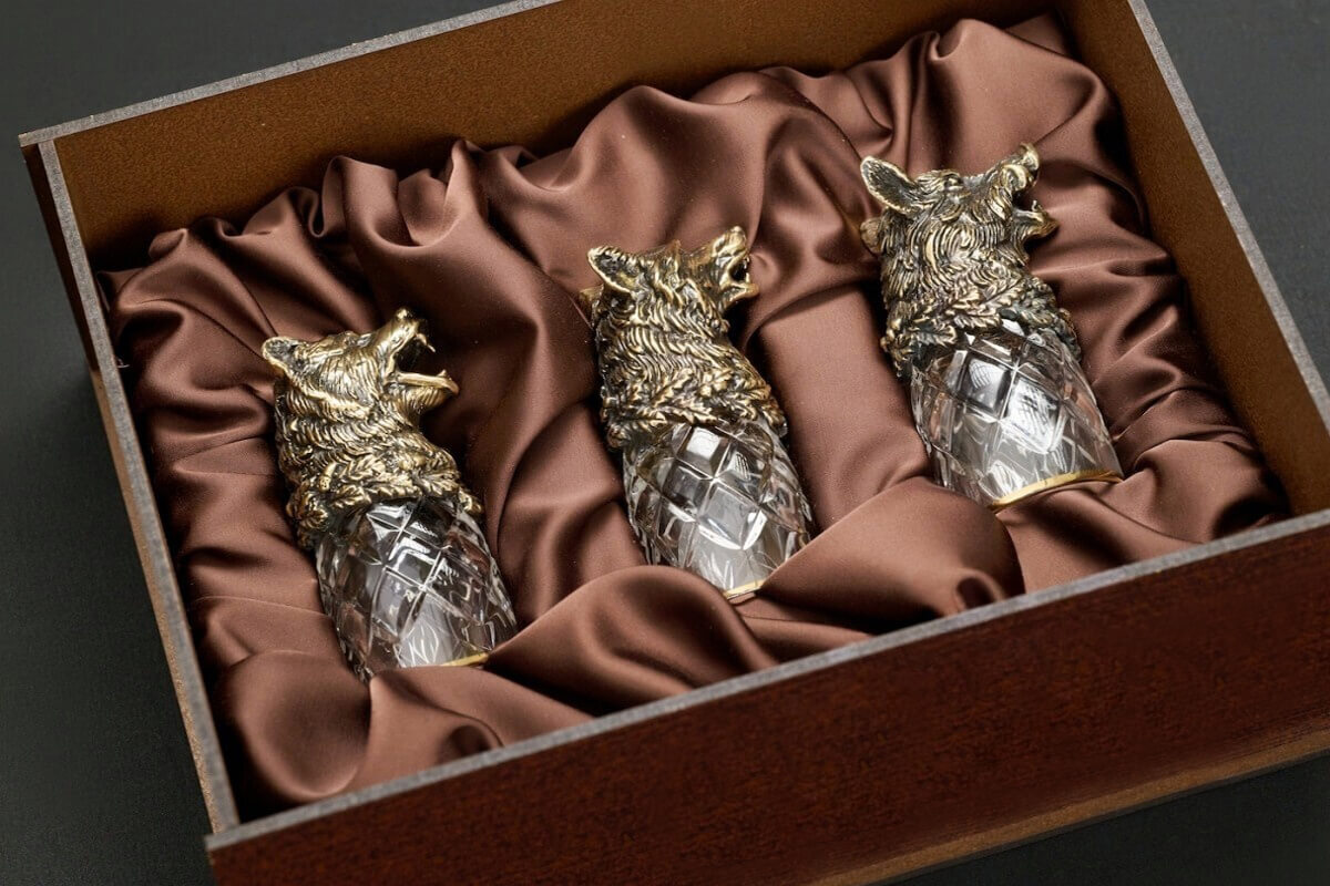 Рюмки выполнены из хрусталя, ножки из патинированной латуни. Набор рюмок - это очень красивый и оригинальный подарок, его можно вручить практически на любой праздник или событие.