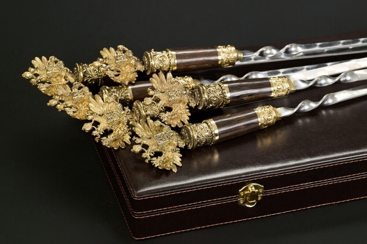 Шампуры ручной работы «Держава» - это очень красивый и практичный подарок, их можно вручить практически на любой праздник или событие. Каждый Двуглавый орел изготовлен из латуни, имеет идеальную детализацию и прорисовку всех элементов.