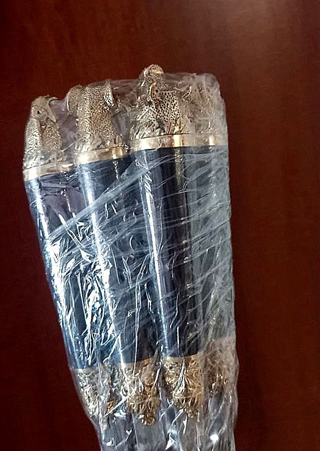 Рукояти выполнены из ценной породы древесины (венге) и украшены фигурными навершиями из латуни, созданными методом художественного литья с последующим покрытием патиной.