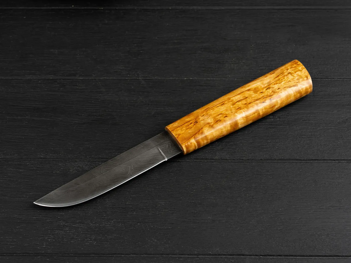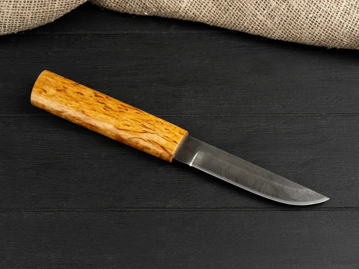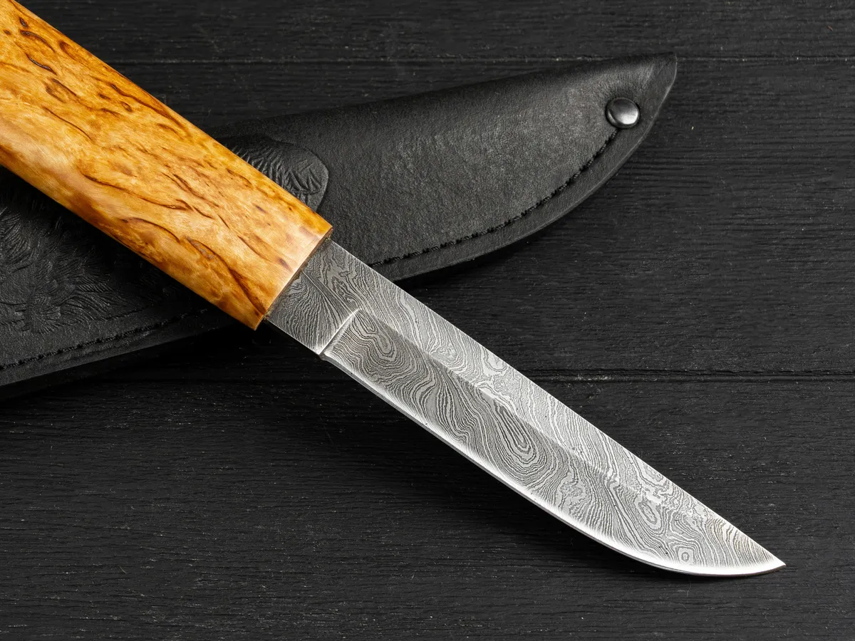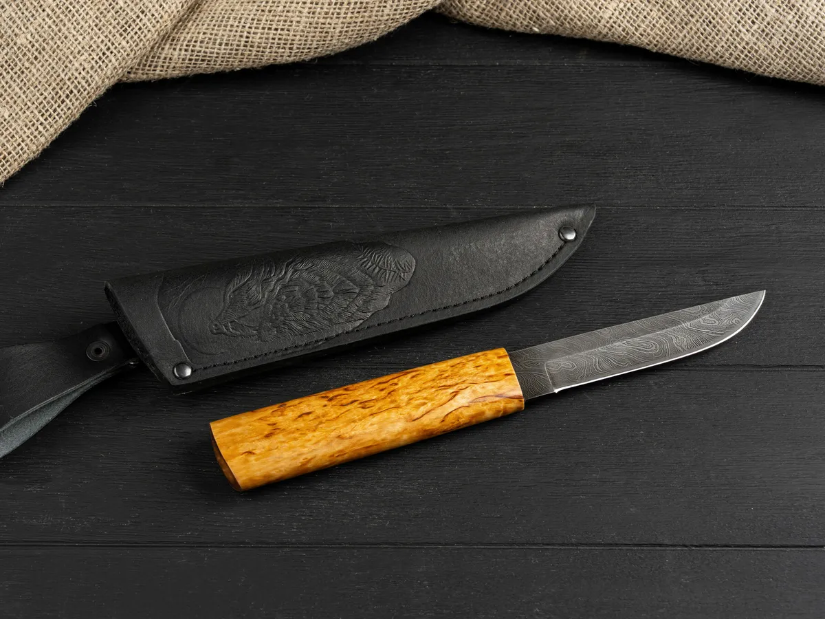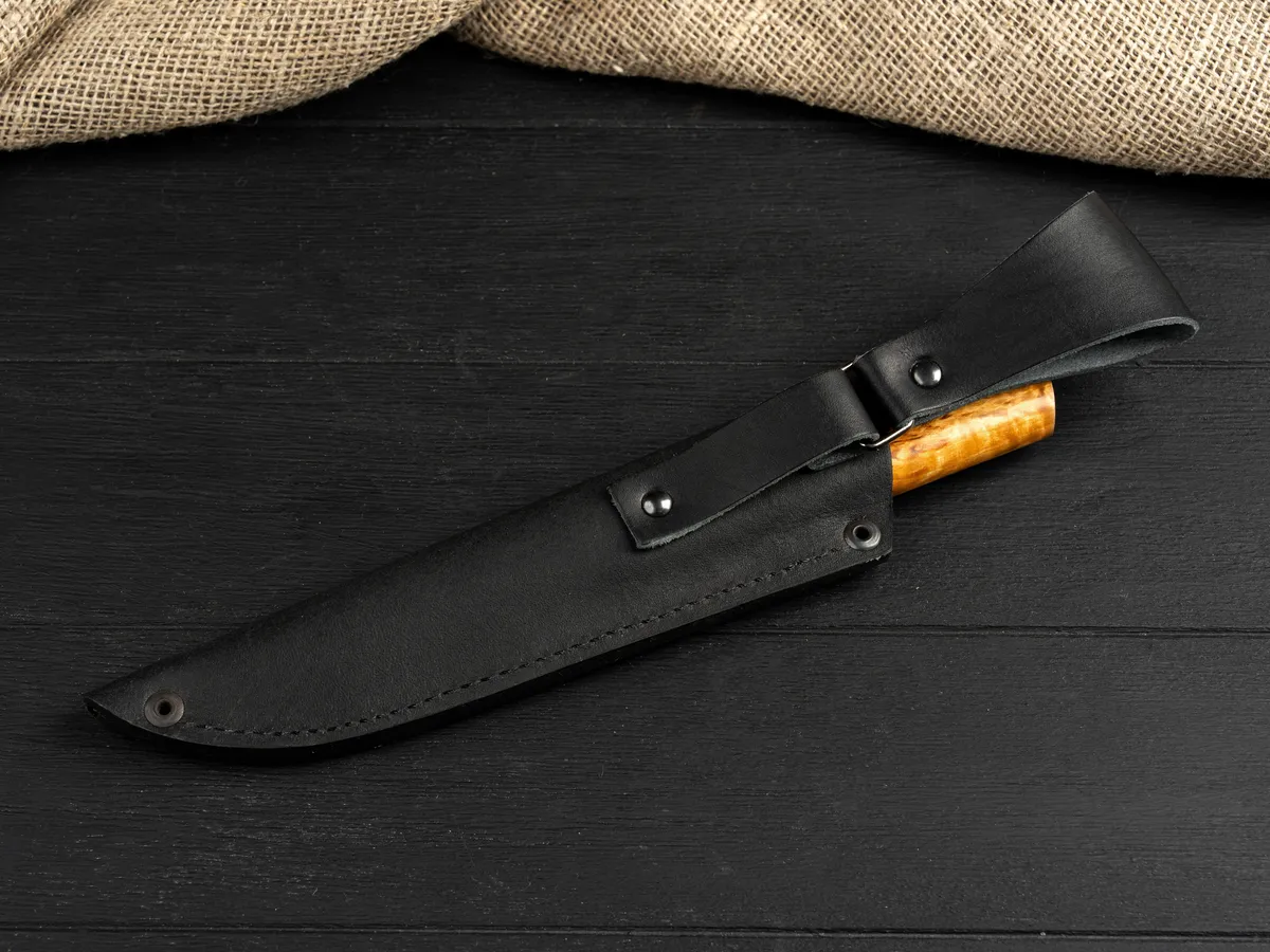 Нож оснащен крепкой рукоятью из карельской березы – красивого прочного материала, который не боится влаги и холода, не рассыхается, не трескается на морозе и умеет удерживать тепло даже при минусовой температуре.