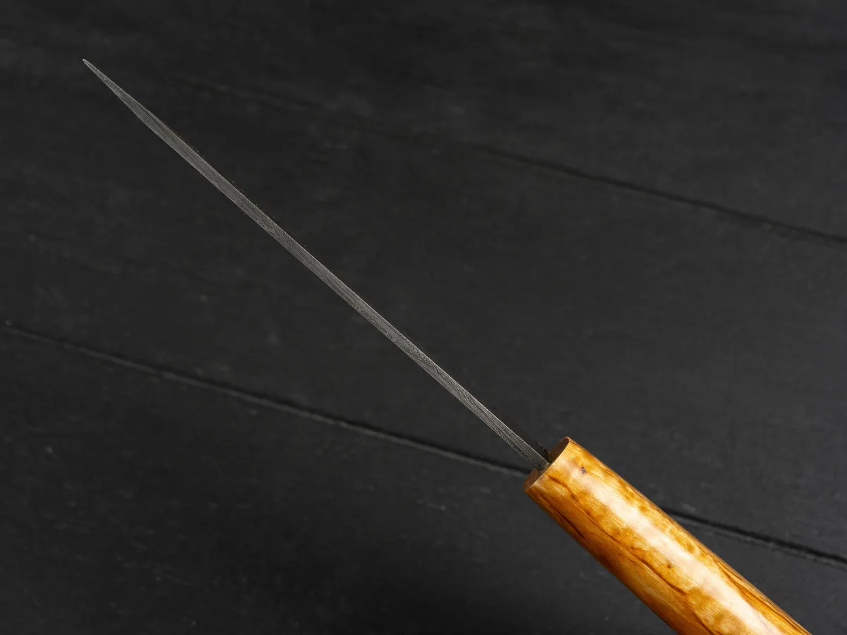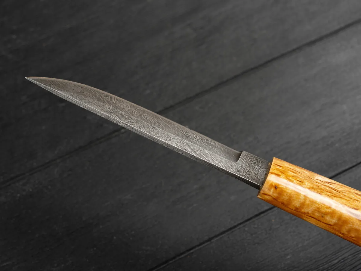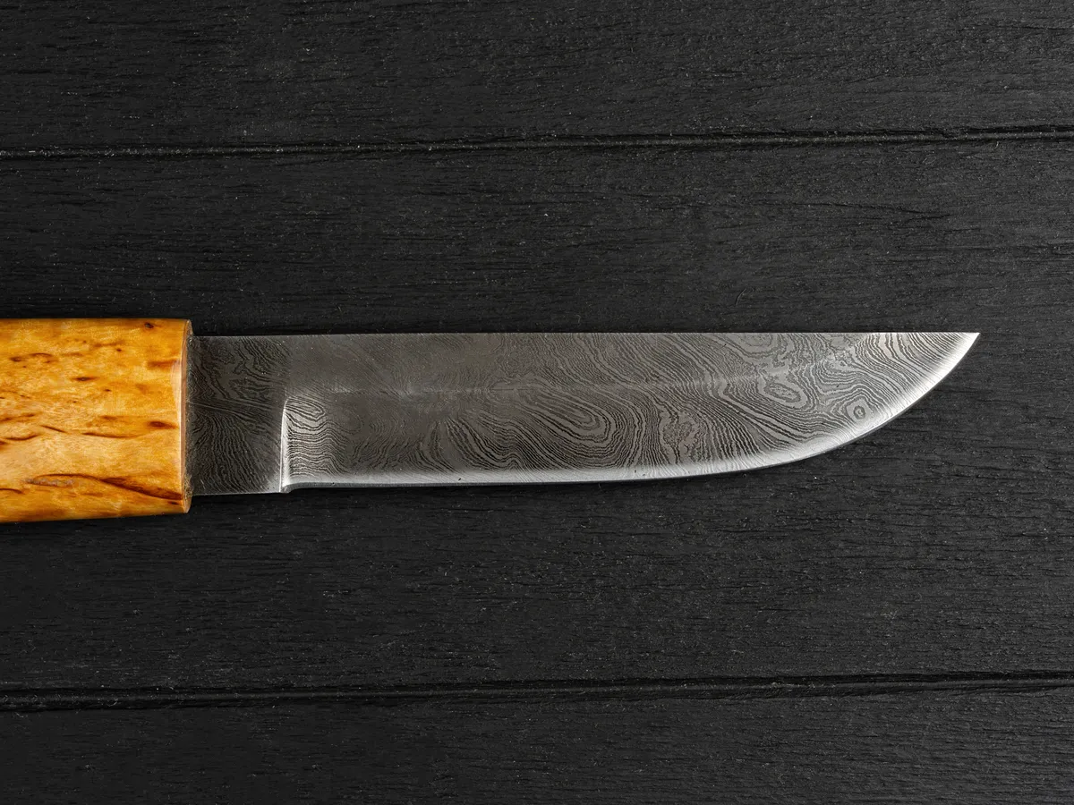 Клинок изготовлен из дамасской стали, что гарантирует его высокую прочность и исключительную остроту. Дамасская сталь не только крепче обычной, но и более износостойкая и декоративно более выигрышная за счет уникального узора. В основу поковки входят четыре марки качественной стали: У8А, ШХ-15, 5ХНМА и 45х13. Твердость клинка после закалки составляет 60 единиц HRC. Микро-подвод на лезвии максимально острый – 0,3 мм, а режущая кромка образует тончайшую микро-пилу благодаря тому, что в дамасской стали чередуются слои металла с низким и высоким содержанием углерода (всего таких слоев около 400).