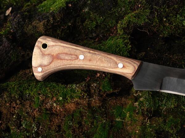 Легко рубит кустарник, валит небольшие деревья, строгает, расчищает место для стоянки, со всем справляется отлично. Углеродистая сталь прочная и острая, и, что самое главное, заточку держит хорошо. Рукоять удобно лежит в руке, не натирает. Прикольный инструмент!