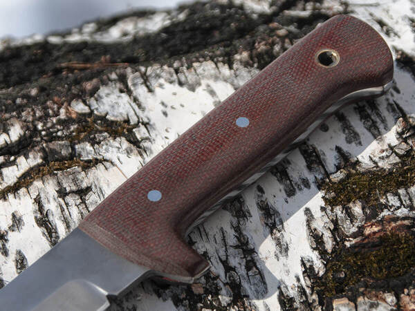 Анатомическая форма рукояти обеспечивает идеальное прилегание к ладони. Большой выступ в области гарды гарантирует безопасное использование ножа при силовых работах. Еще одна удачная деталь – эффектный «глазок» в мельхиоровой трубке для темляка.