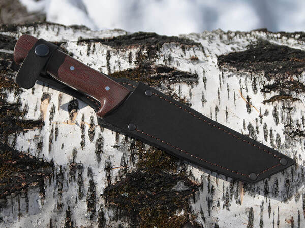 К изделию прилагаются ножны из натуральной кожи с подвесом для ношения на поясе и кнопочным хлястиком, страхующим от потери. Нож в таких ножнах плотно упакован, удобен в переноске, не вываливается и не болтается при тряске. Кожа окрашена в черный цвет, аккуратно прошита и проклепана, хорошо держит форму и приятна на ощупь.