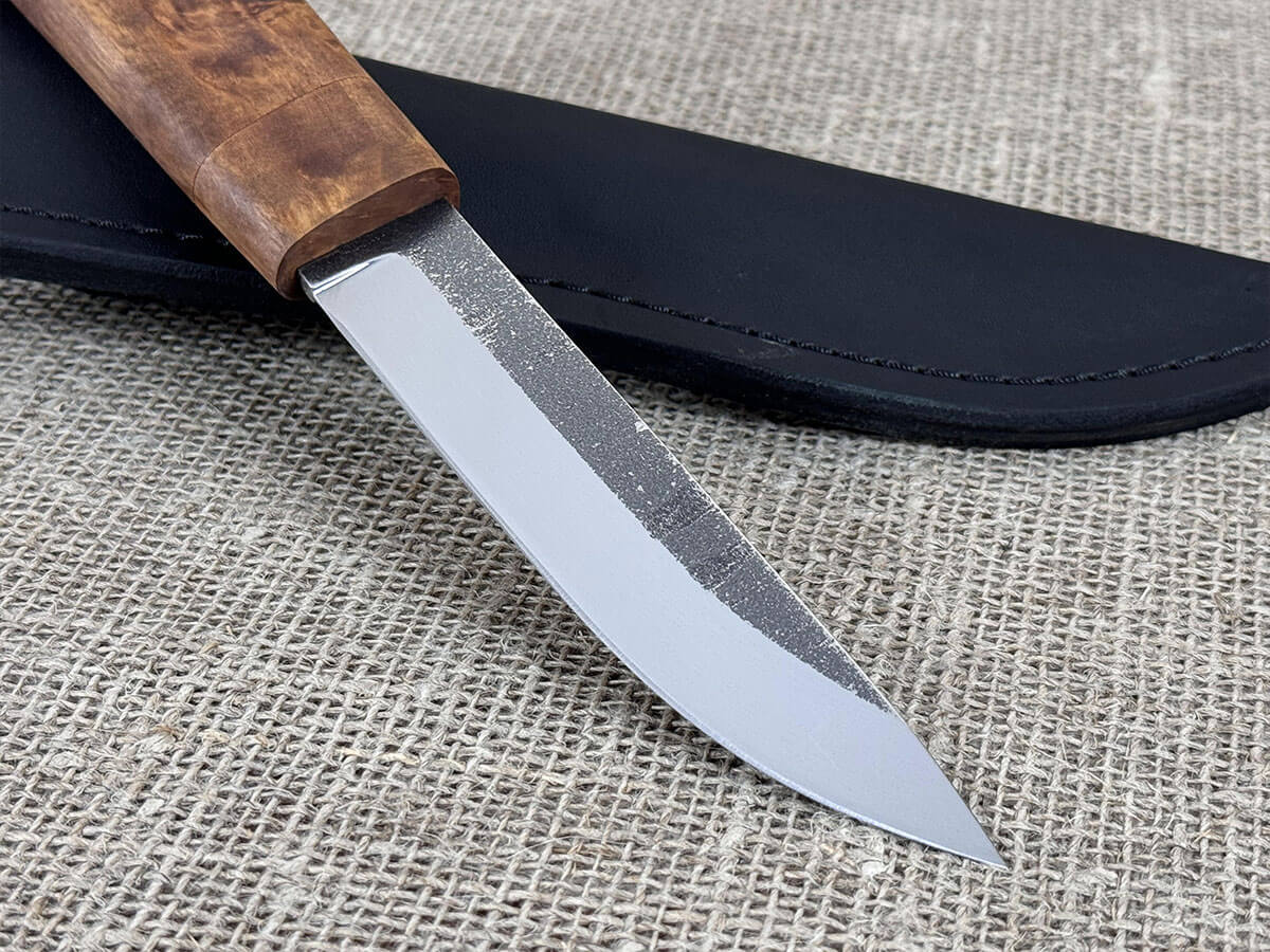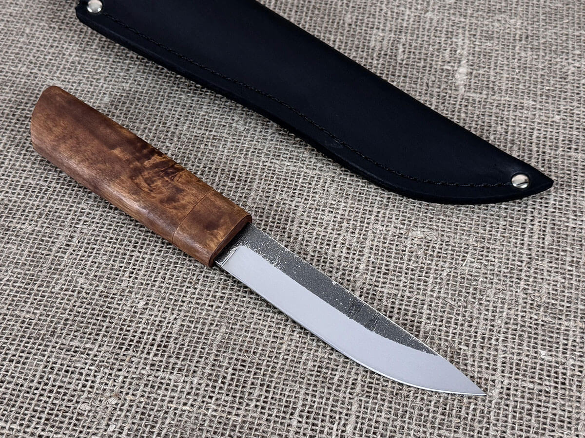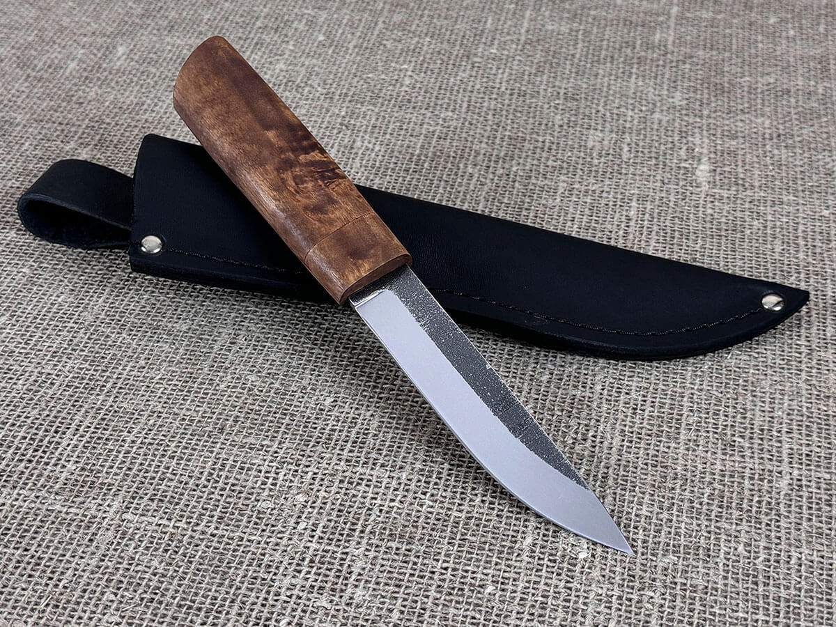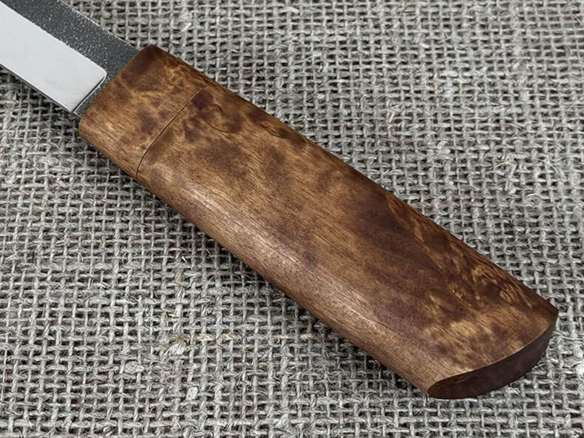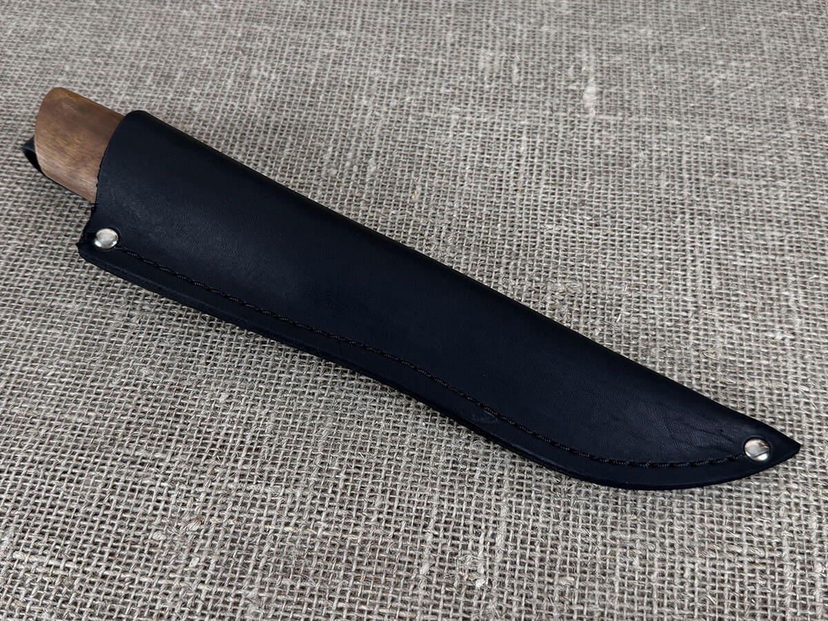 Нож оснащен крепкой рукоятью из мореной карельской березы – красивого прочного материала, который не боится влаги и холода, не рассыхается, не трескается на морозе и умеет удерживать тепло даже при минусовой температуре. По сравнению с обычной мореная древесина отличается особой монолитной прочностью за счет долго пребывания в воде и имеет более темный и насыщенный цвет.