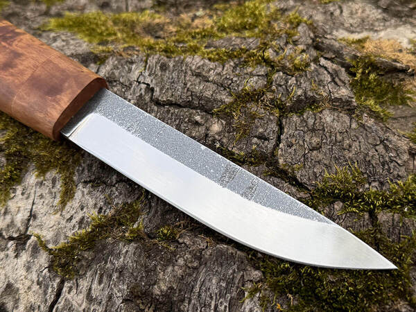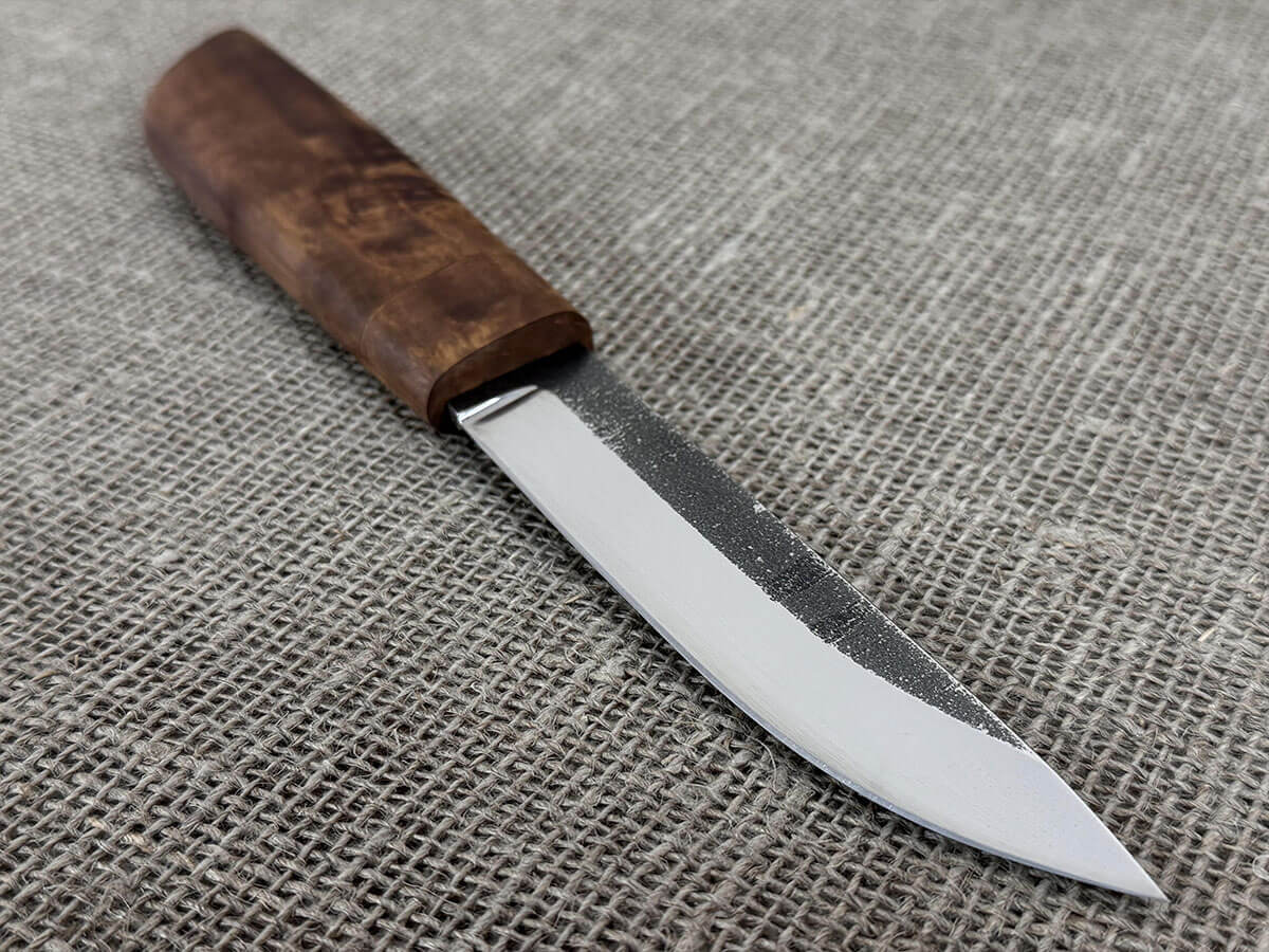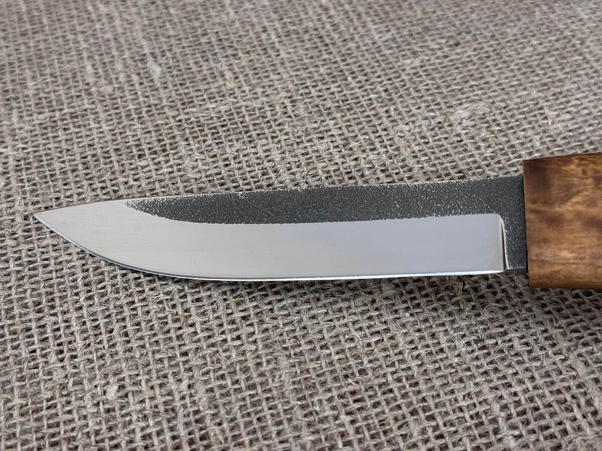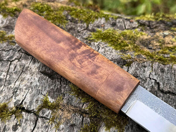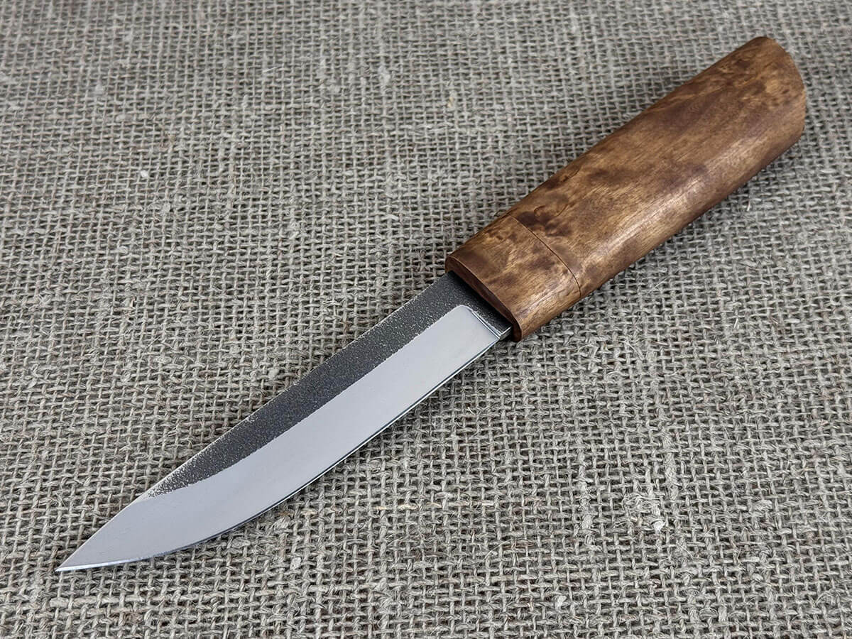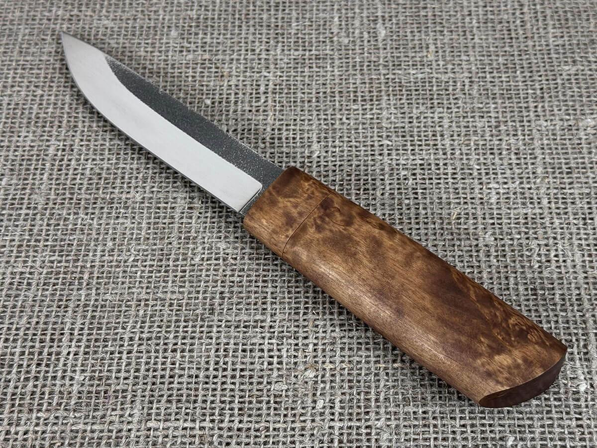 Нож оснащен крепкой рукоятью из мореной карельской березы – красивого прочного материала, который не боится влаги и холода, не рассыхается, не трескается на морозе и умеет удерживать тепло даже при минусовой температуре. По сравнению с обычной мореная древесина отличается особой монолитной прочностью за счет долго пребывания в воде и имеет более темный и насыщенный цвет.