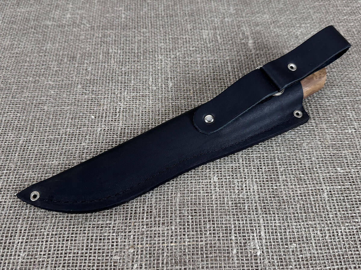 К изделию прилагаются ножны из натуральной кожи с подвесом для ношения на поясе. Нож в таких ножнах плотно упакован, удобен в переноске, не вываливается и не болтается при тряске. Кожа окрашена в черный цвет, аккуратно прошита, хорошо держит форму и приятна на ощупь