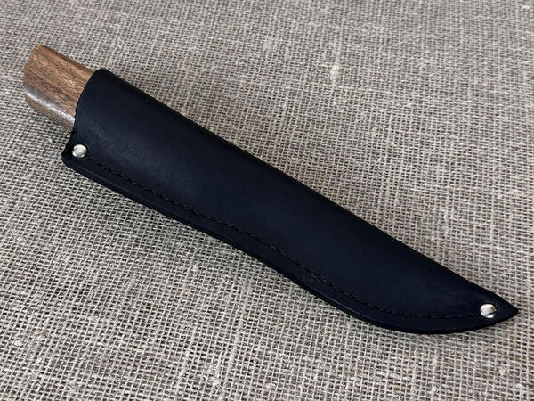 К изделию прилагаются ножны из натуральной кожи с подвесом для ношения на поясе. Нож в таких ножнах плотно упакован, удобен в переноске, не вываливается и не болтается при тряске. Кожа окрашена в черный цвет, аккуратно прошита, хорошо держит форму и приятна на ощупь.