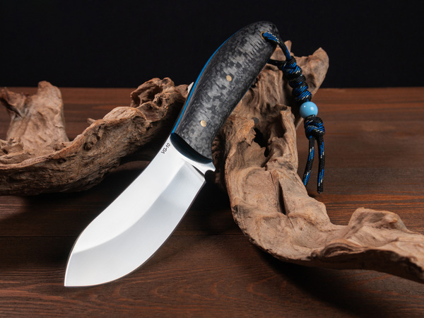 Графитно-серая рукоять с вафельным узором и синяя прослойка спейсера эффектно дополняют зеркально полированную сталь. На природе такой нож выглядит так же уместно и естественно, как кусок задубелой коры или древесного угля. Подобранный в тон темляк крученым ручейком стекает с тыльника и прекрасно смотрится на руке.