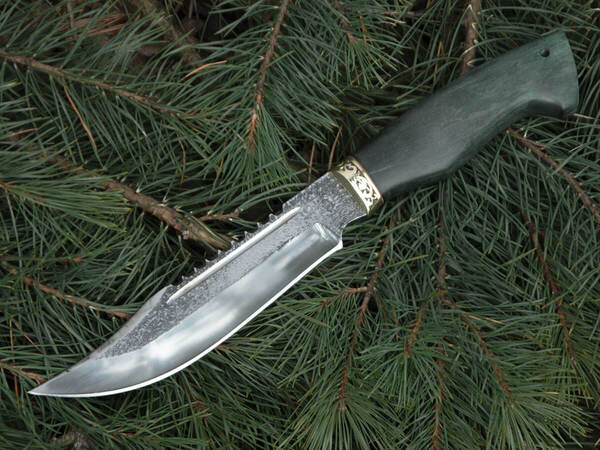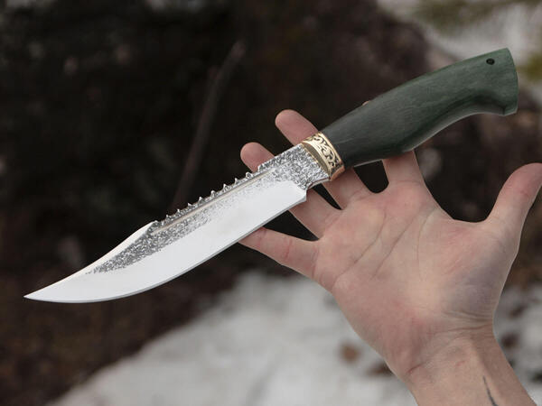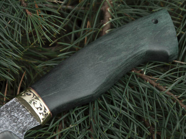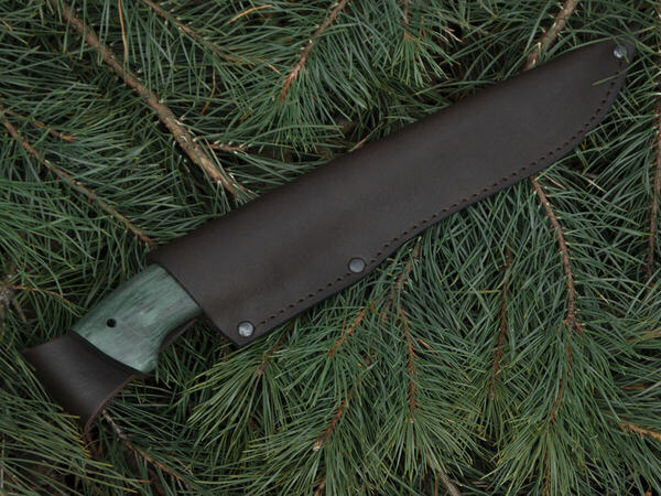 Нож оснащен рукоятью из цельного куска стабилизированной карельской березы в зеленой гамме. Этот красивый и прочный материал не боится влаги, не скользит в мокрой ладони, не рассыхается, не трескается на морозе и удерживает тепло даже при минусовой температуре.