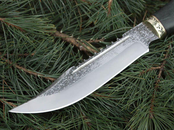 Нож «Алтай» обладает уникальным дизайном, сочетающим агрессивность и изящество. Грозный силуэт клинка, зазубрины на обухе и нешлифованная голомень придают ему вид опасного хищника. В то же время элегантная рукоять и растительный узор на больстере вносят в этот брутальный образ нотку изысканности.