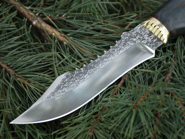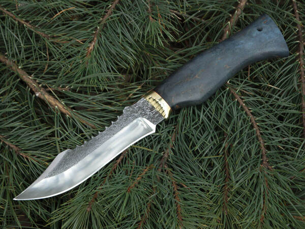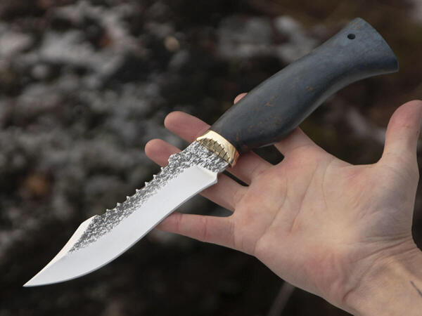 Нож «Щукарь» имеет неповторимый дизайн и уникальную ауру, связывающую его с дикой лесной природой. Острые зазубрины на обухе придают ему сходство с хребтом щуки, нешлифованная голомень напоминает поверхность коры, а борозды на больстере как будто оставлены когтями зверя.