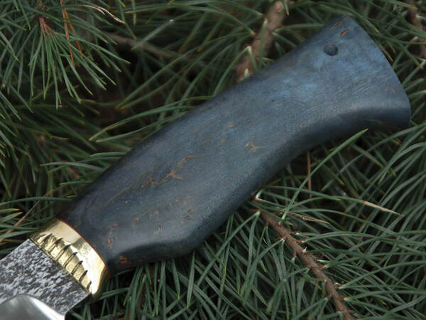 Нож имеет прочный и эффектный больстер, изготовленный из художественной латуни. Он надежно выполняет свои защитные функции, а его золотистый цвет идеально подходит к ультрамариновому цвету рукояти.