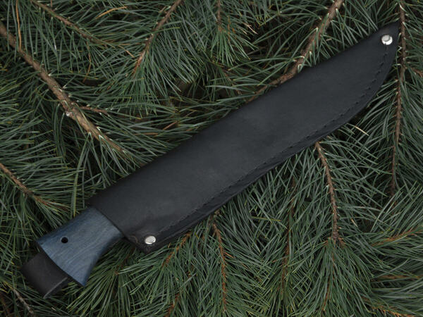 Прилагаемые к изделию ножны классической формы, сделаны из толстой натуральной кожи и снабжены свободным и фиксированным подвесом. Нож входит в них глубоко, почти до тыльника, клинок сидит плотно и не болтается при тряске. Кожа окрашена в цвет рукояти, аккуратно проклепана и прошита, хорошо держит форму и приятна на ощупь.