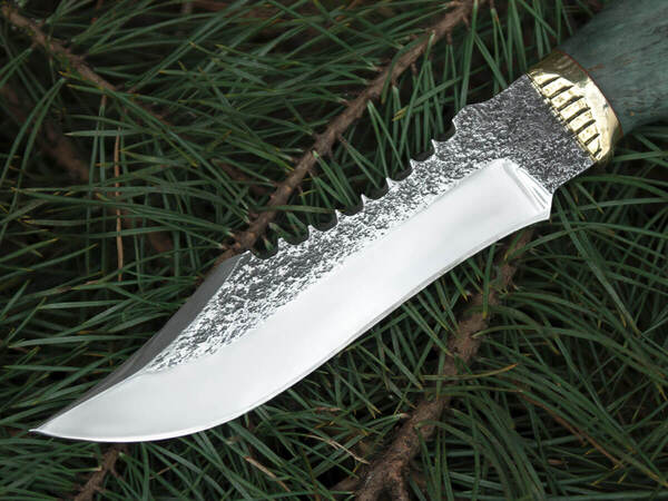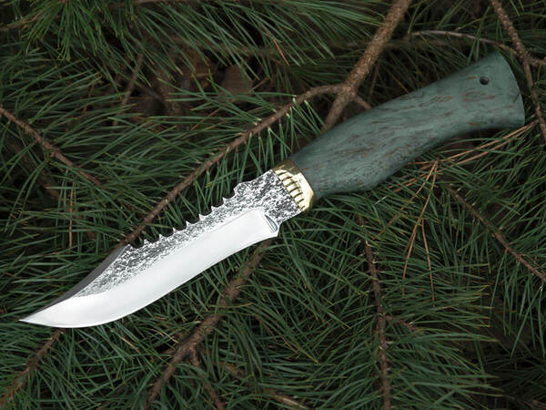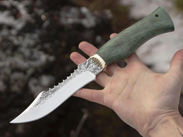 Нож «Щукарь» имеет неповторимый дизайн и уникальную ауру, связывающую его с дикой лесной природой. Острые зазубрины на обухе придают ему сходство с хребтом щуки, нешлифованная голомень напоминает поверхность коры, а борозды на больстере как будто оставлены когтями зверя.