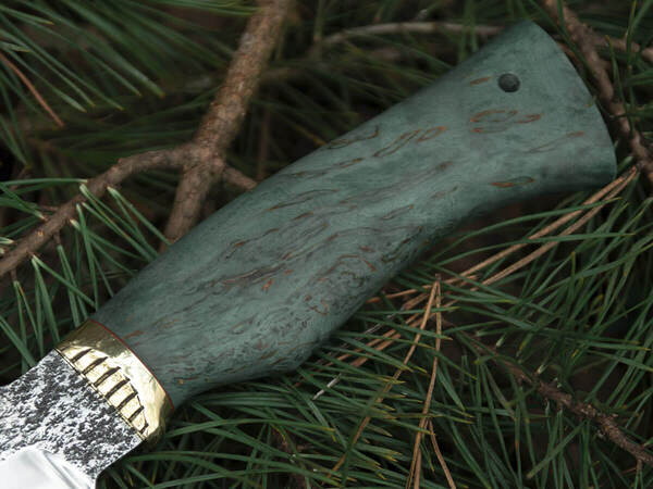 Нож имеет прочный и эффектный больстер, изготовленный из художественной латуни. Он надежно выполняет свои защитные функции, а его золотистый цвет идеально подходит к зеленому тону рукояти.