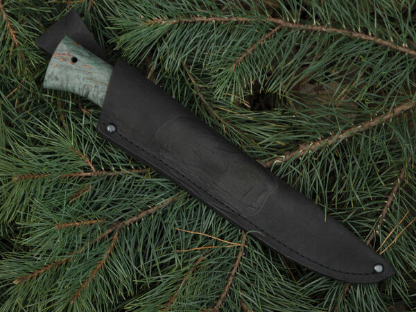 Нож оснащен рукоятью из цельного куска стабилизированной карельской березы. Этот красивый и прочный материал не боится влаги, не скользит в мокрой ладони, не рассыхается, не трескается на морозе и удерживает тепло даже при минусовой температуре.
