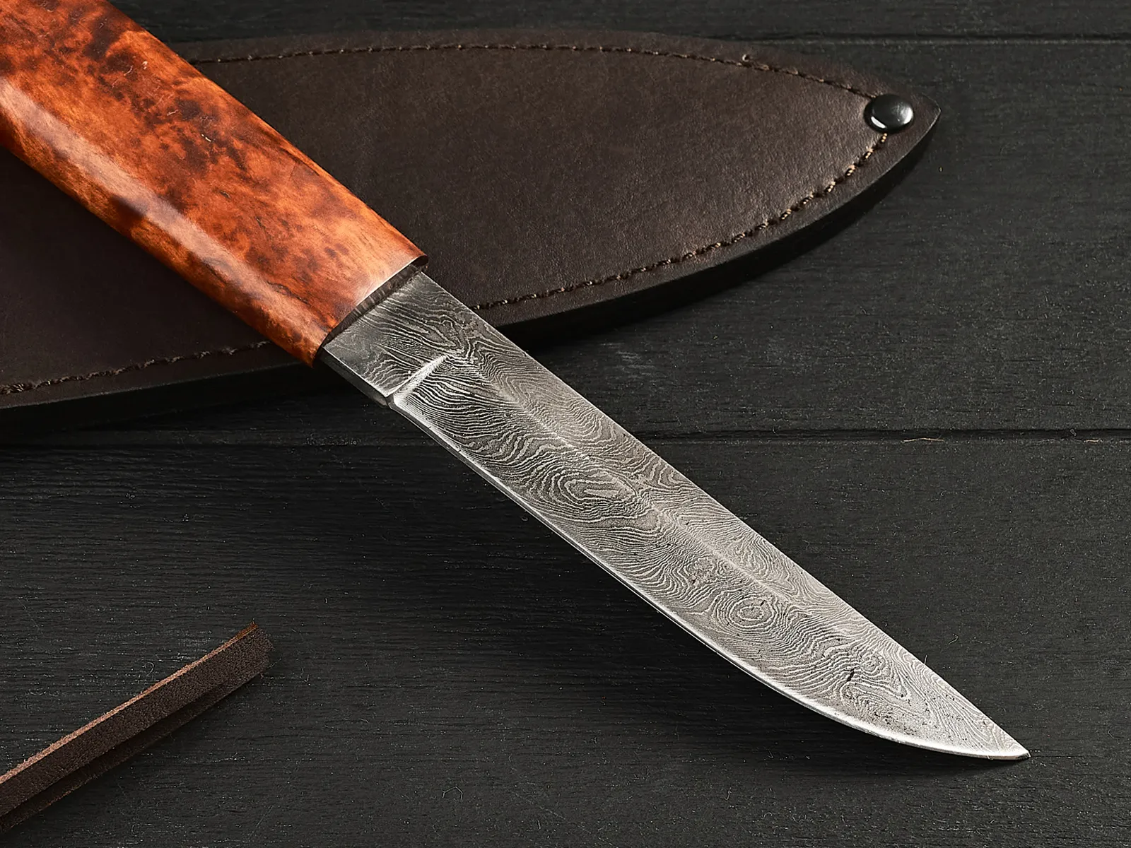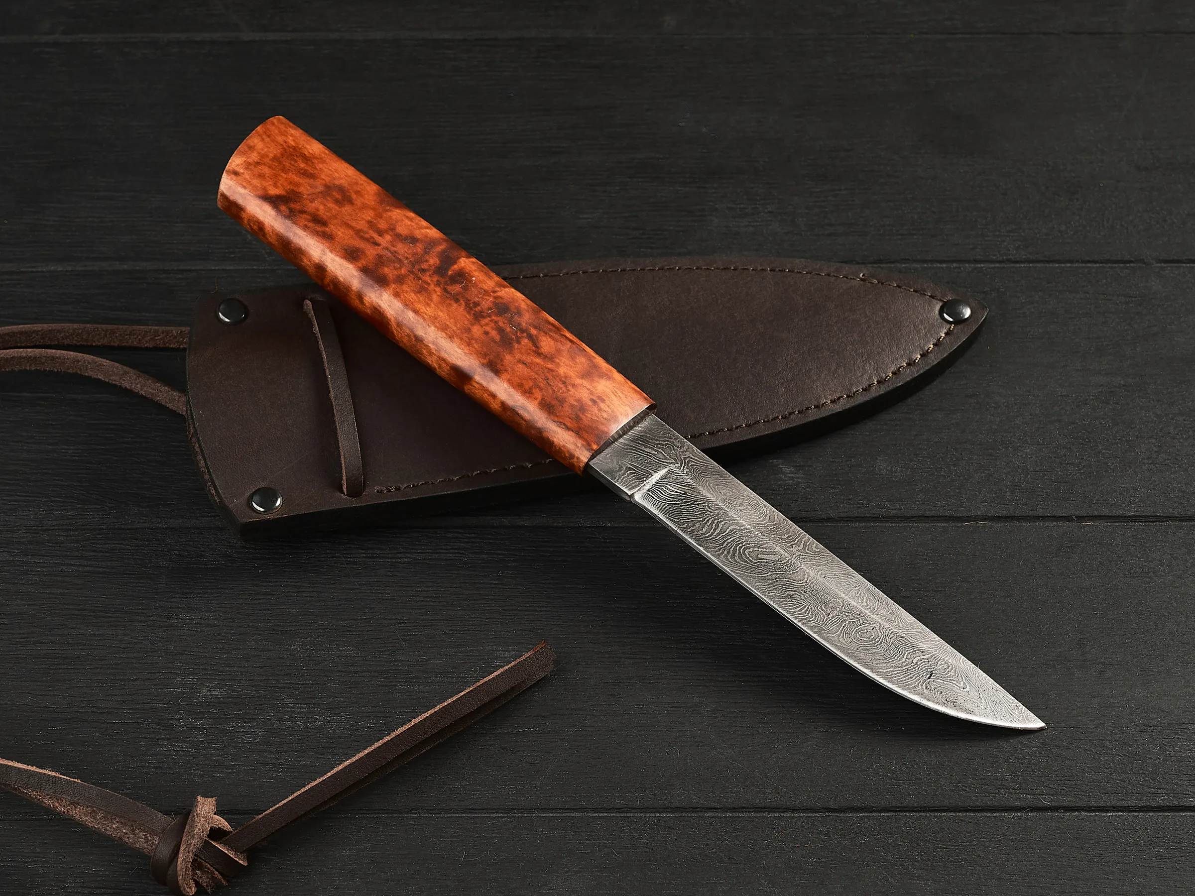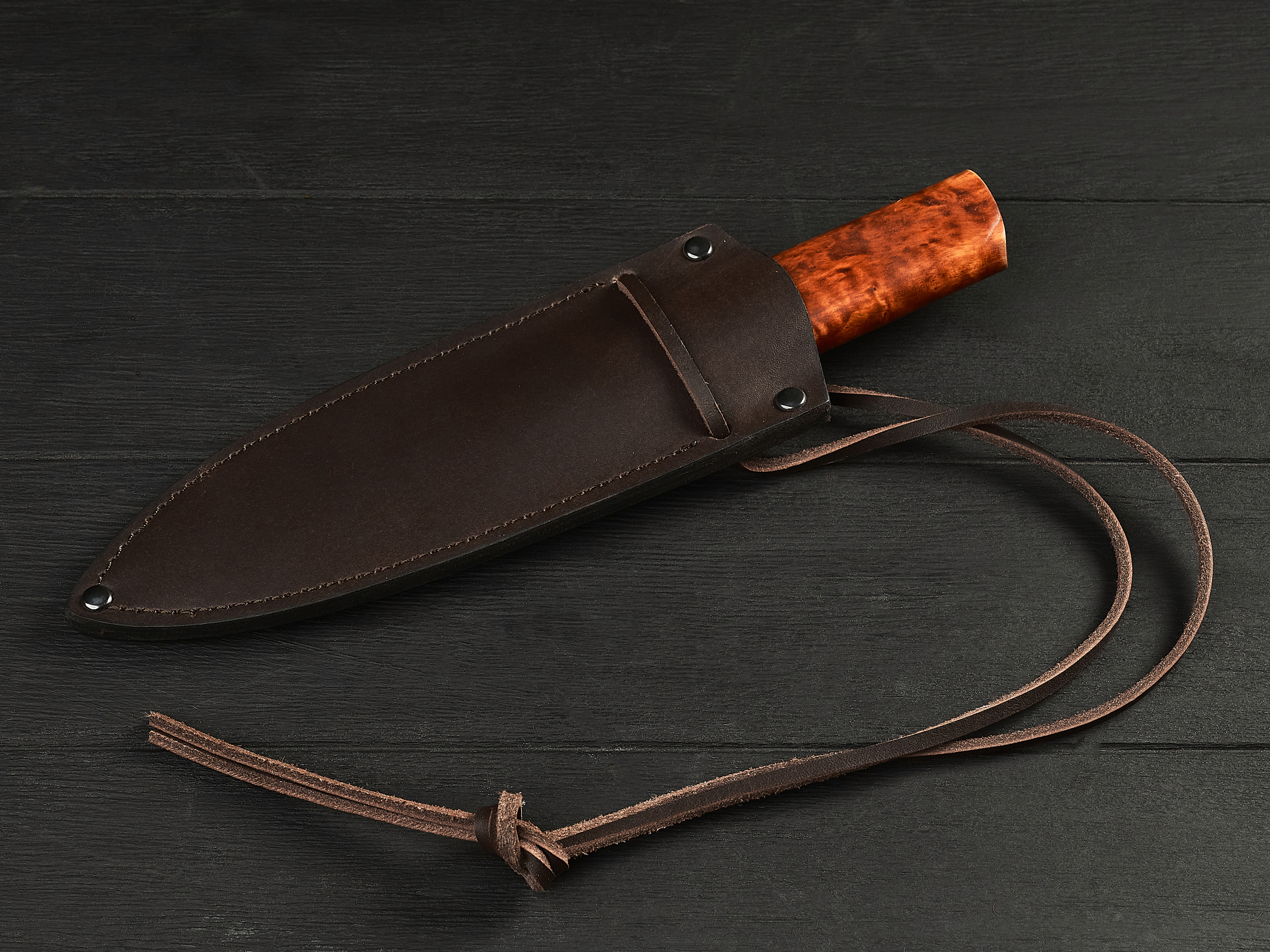 Нож оснащен крепкой рукоятью из мореной карельской березы – красивого прочного материала, который не боится влаги и холода, не рассыхается, не трескается на морозе и умеет удерживать тепло даже при минусовой температуре.