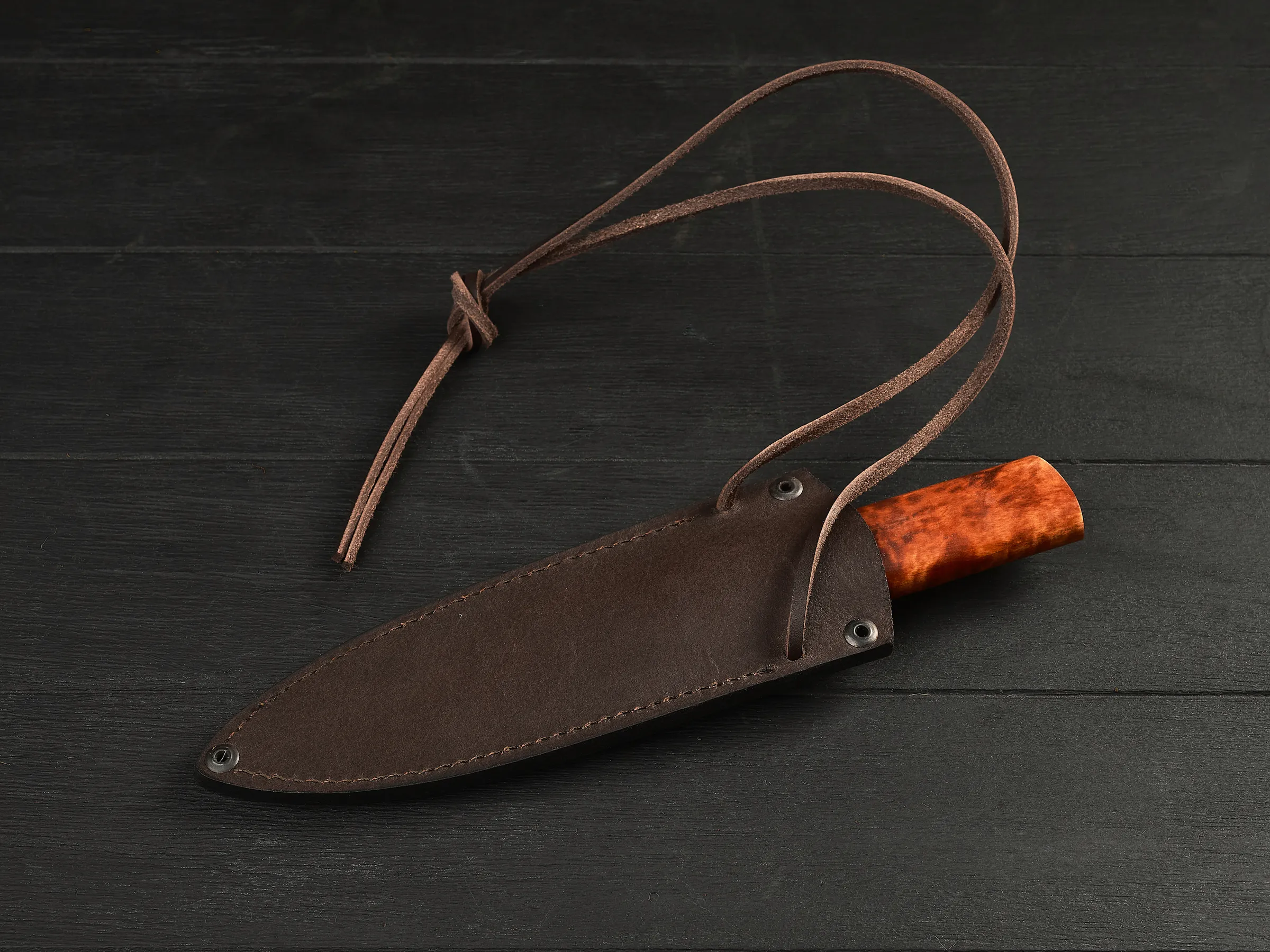 К изделию прилагаются ножны шейного ношения, выполненные из толстой натуральной кожи. Нож уходит в них почти целиком и сидит плотно, не вываливаясь и не болтаясь при тряске. Кожа окрашена в черный цвет, аккуратно прошита, хорошо держит форму и приятна на ощупь