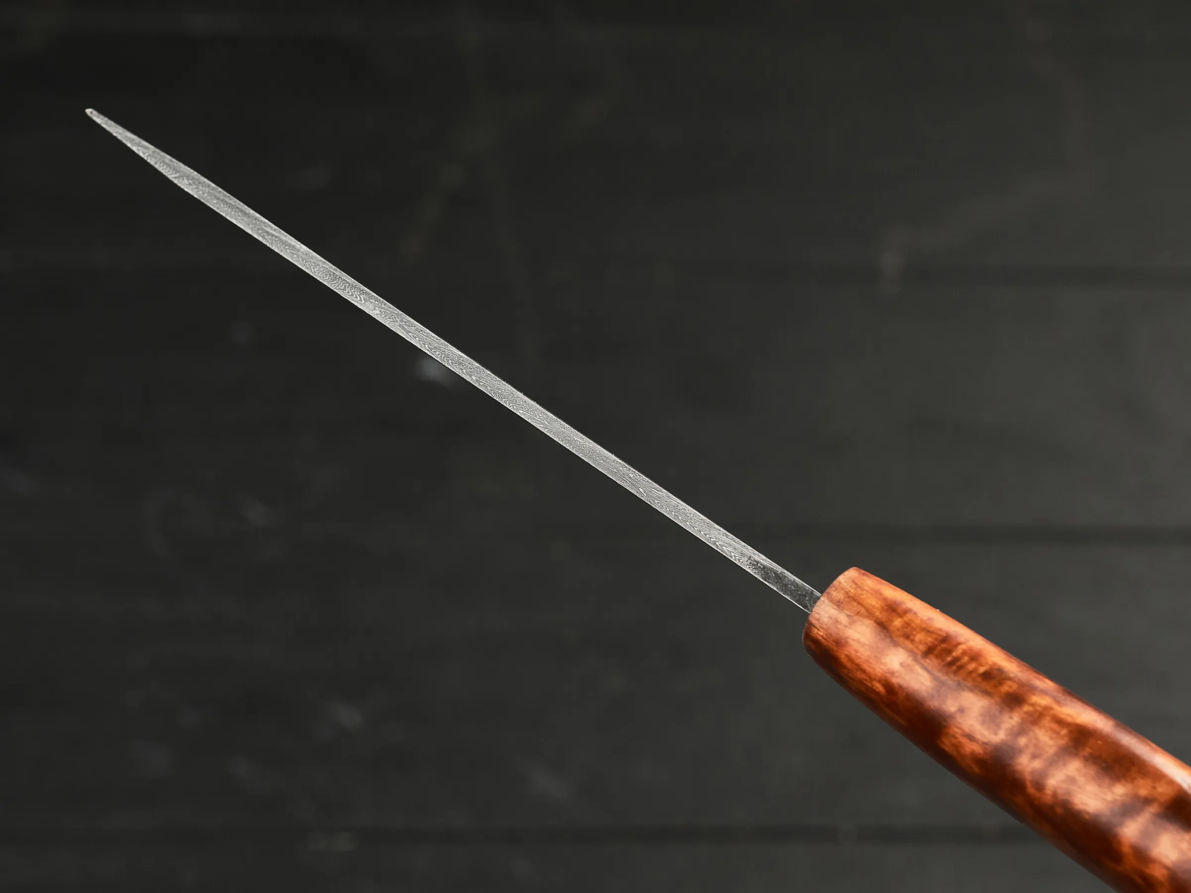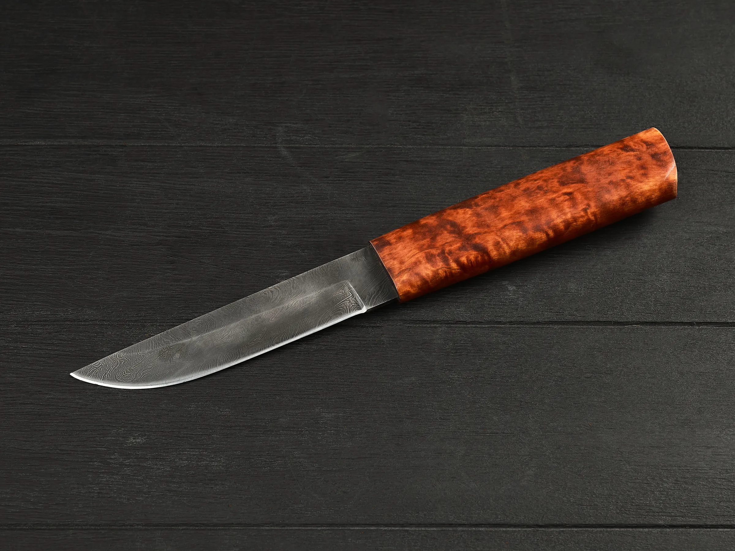 Рукоять хваткая, не скользит в мокрой ладони, брать ее в руку удобно и приятно. Рисунок древесины всегда уникален и делает эксклюзивным каждый экземпляр ножа.