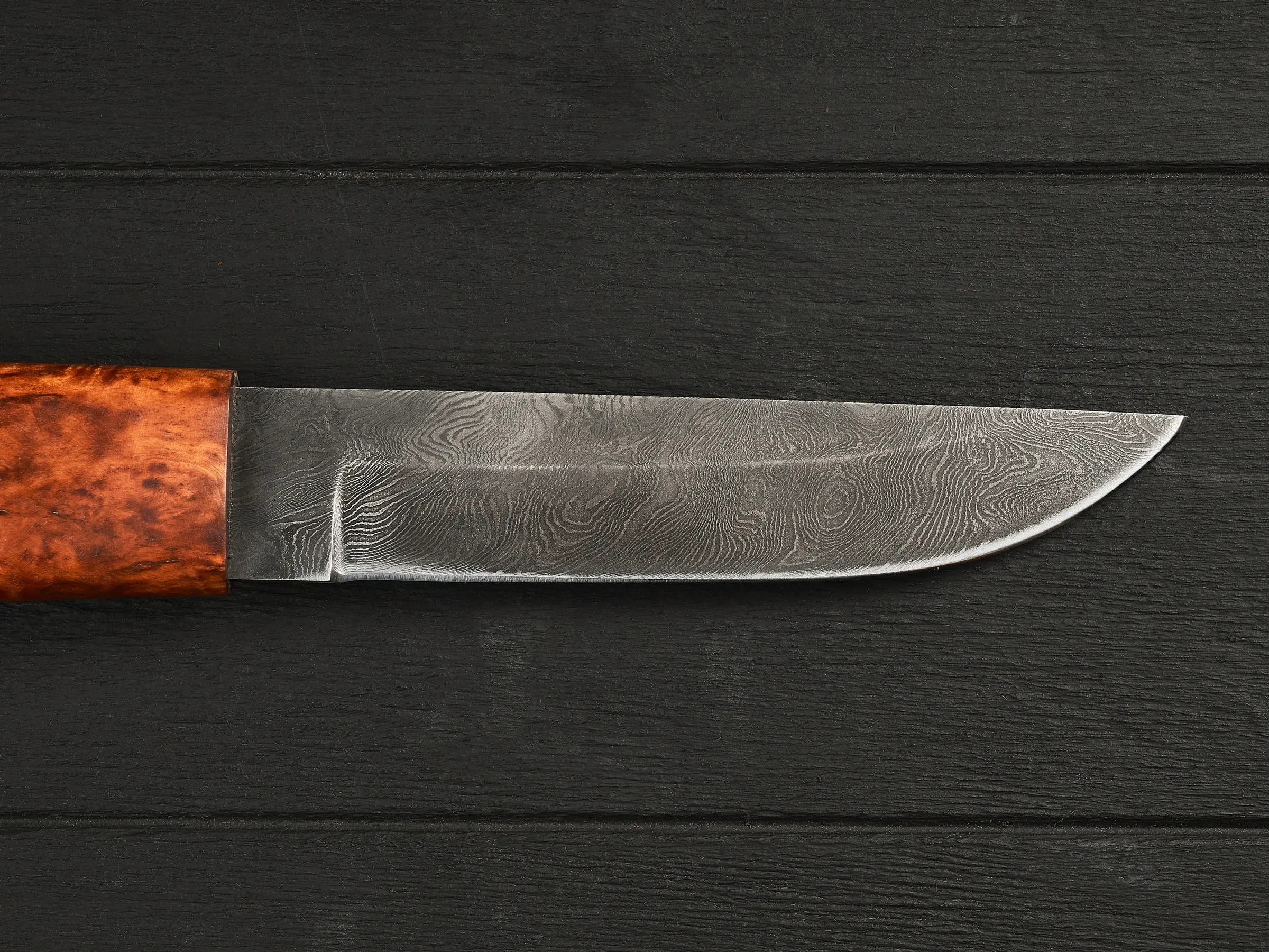 Клинок изготовлен из дамасской стали, что гарантирует его высокую прочность и исключительную остроту. Дамасская сталь не только крепче обычной, но и более износостойкая и декоративно более выигрышная за счет уникального узора. В основу поковки входят четыре марки качественной стали: У8А, ШХ-15, 5ХНМА и 45х13. Твердость клинка после закалки составляет 60 единиц HRC. Микро-подвод на лезвии максимально острый – 0,3 мм, а режущая кромка образует тончайшую микро-пилу благодаря тому, что в дамасской стали чередуются слои металла с низким и высоким содержанием углерода (всего таких слоев около 400).