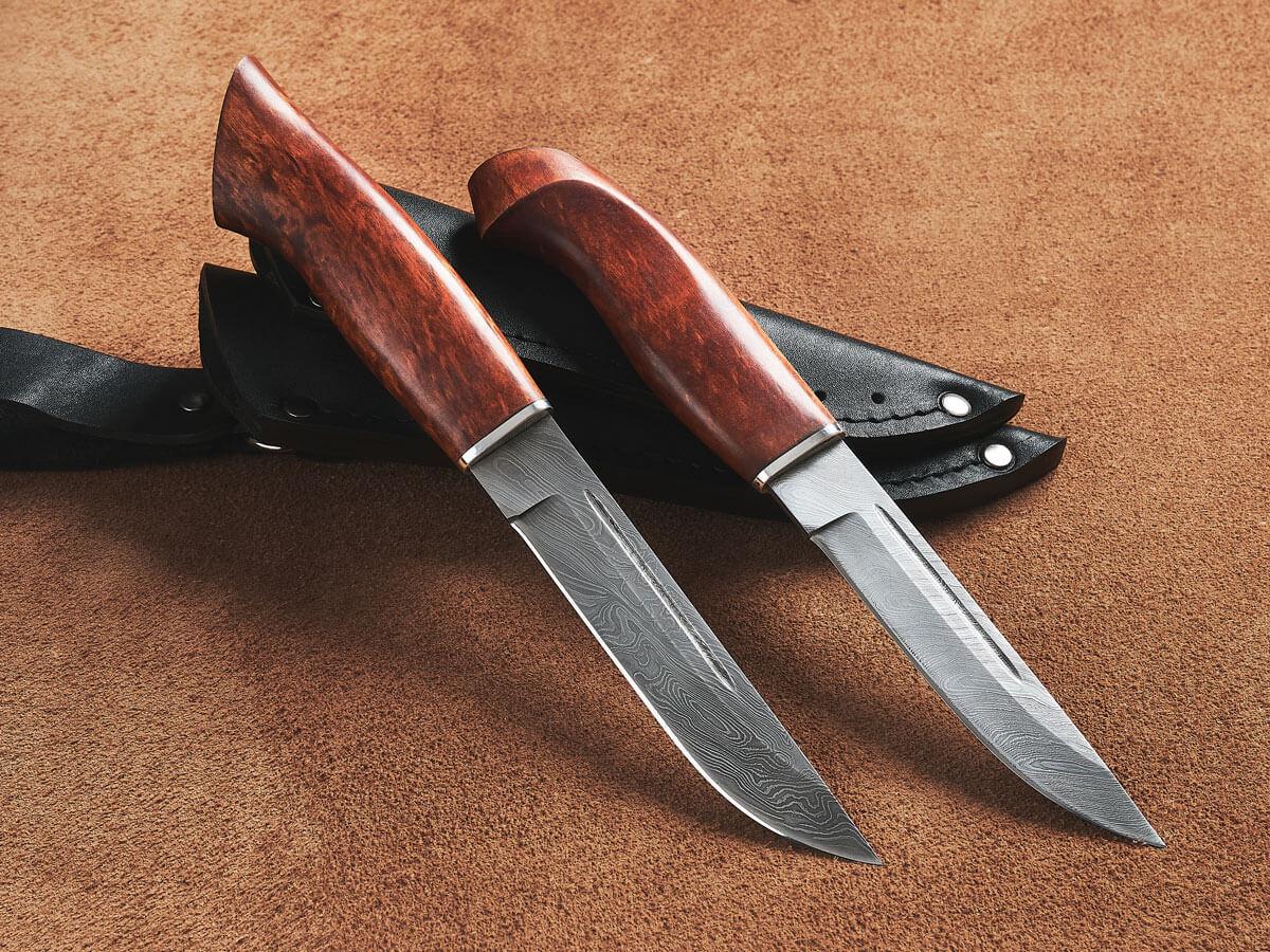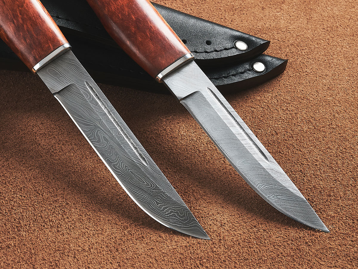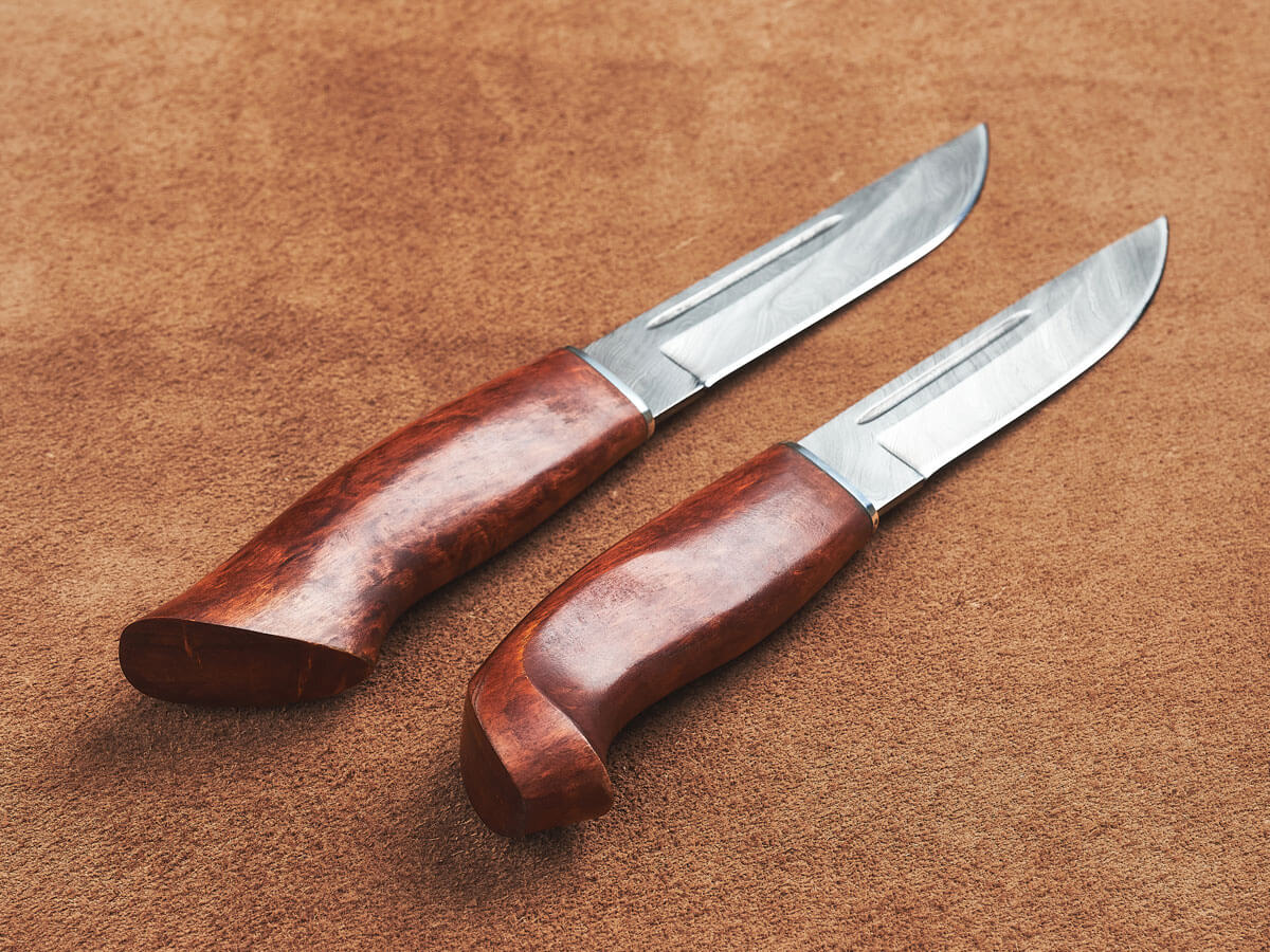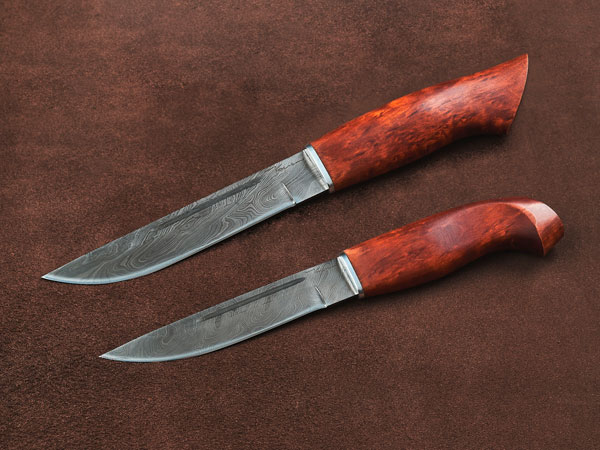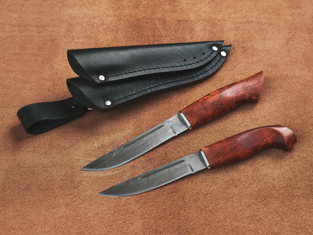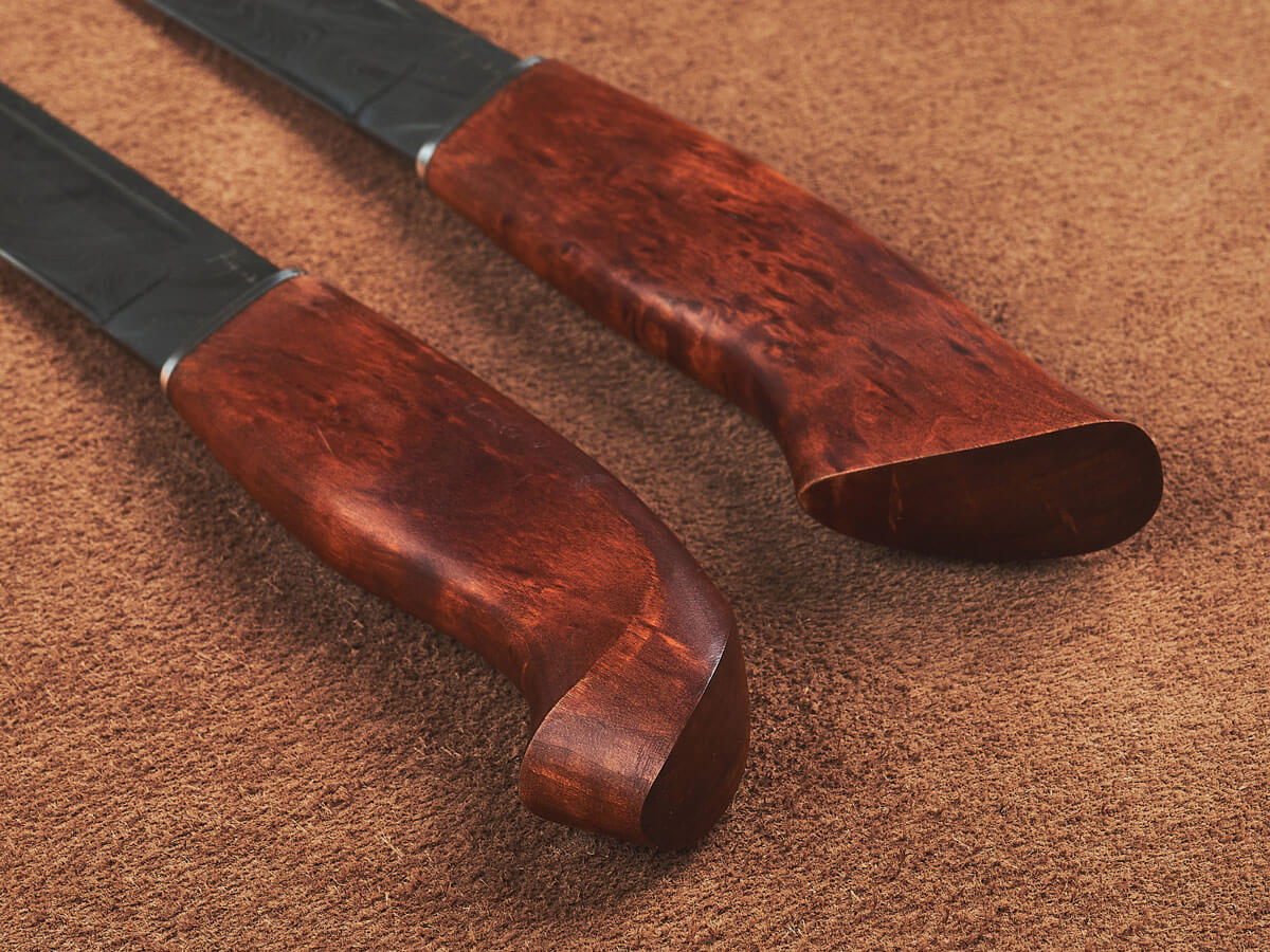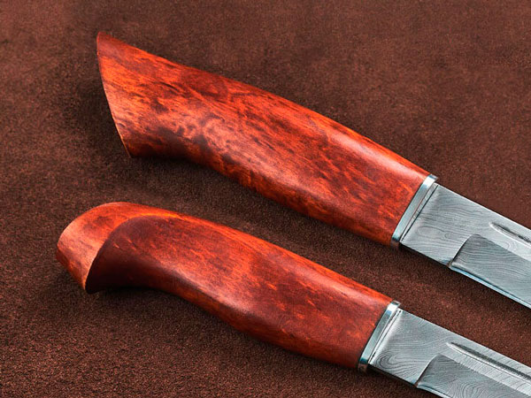 Ножи оснащены крепкой рукоятью из карельской березы – красивого прочного материала, который не боится влаги и холода, не рассыхается, не трескается на морозе и умеет удерживать тепло даже при минусовой температуре.