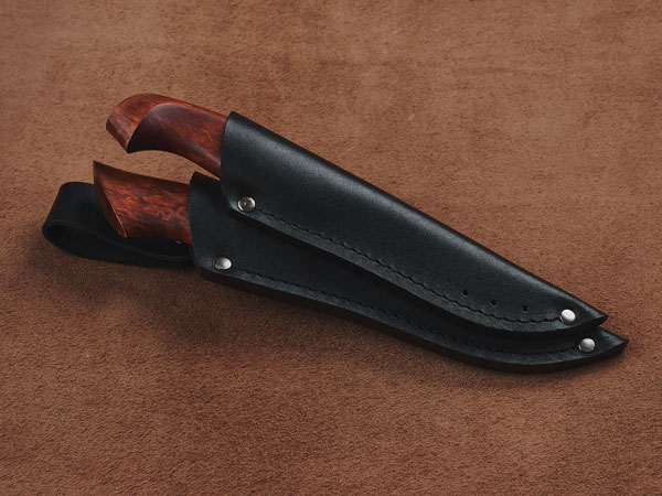 Прилагаемые к изделиям ножны классической формы, сделаны из толстой натуральной кожи и снабжены свободным и фиксированным подвесом. Нож входит в них глубоко, почти до тыльника, клинок сидит плотно и не болтается при тряске. Кожа окрашена в чёрный цвет, аккуратно проклёпана и прошита, хорошо держит форму и приятна на ощупь. Ножны обоих ножей сшиты между собой, образуя единое цельное изделие.