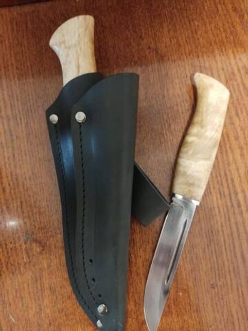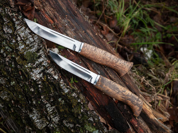 Ножи оснащены крепкой рукоятью из карельской березы – красивого прочного материала, который не боится влаги и холода, не рассыхается, не трескается на морозе и умеет удерживать тепло даже при минусовой температуре.