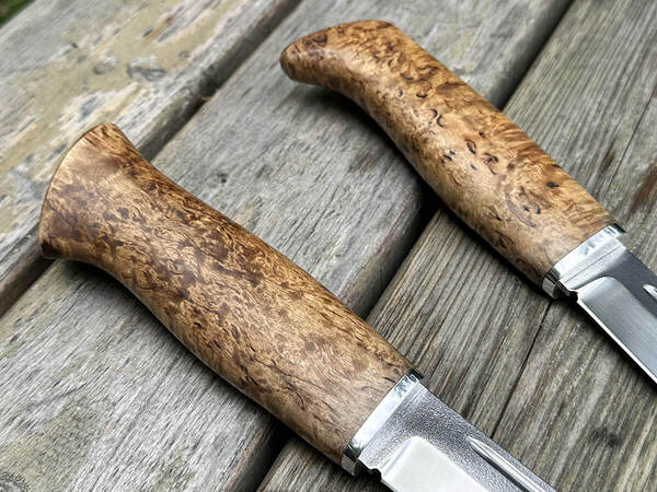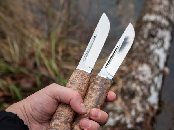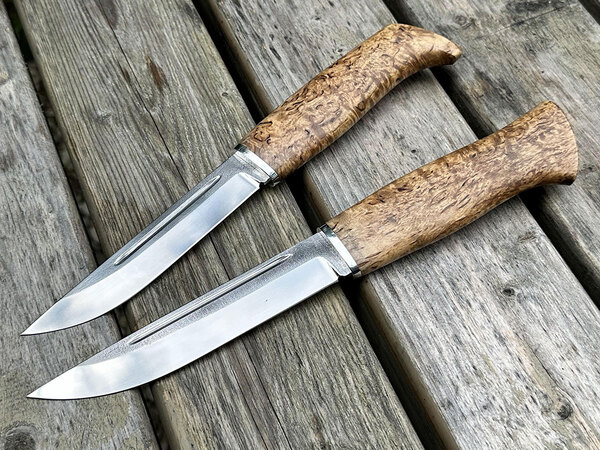 Замечательная спарка финов. Оба ножа сделаны прекрасно. Хорошая сталь, заточку держит идеально. Брал оба ножа в тайгу. Охотился, рубил дрова, готовил мясо. Ножи проявили себя отлично, заточка и клинки не затупились, не поцарапались. Рукояти удобные. Очень доволен.