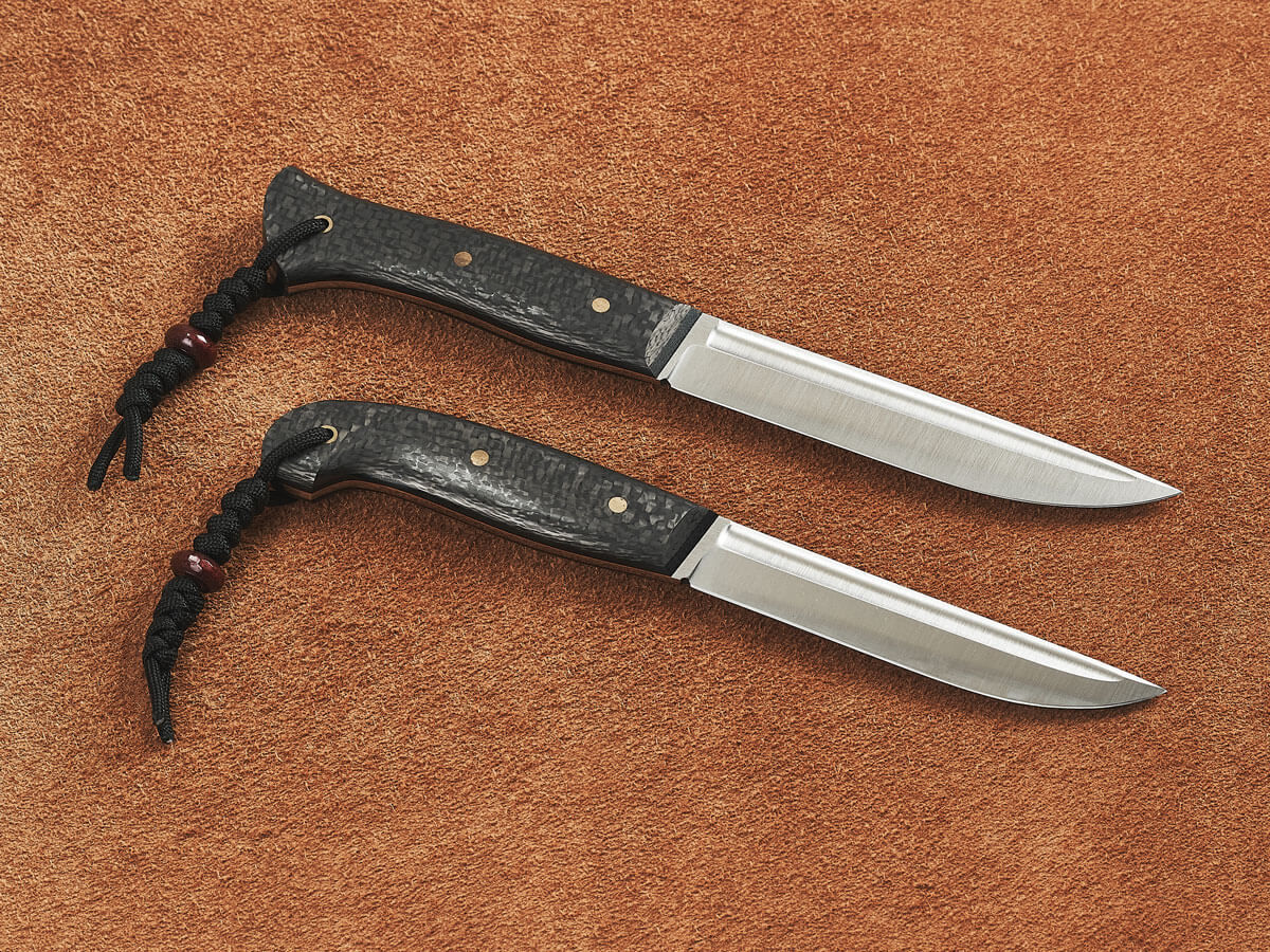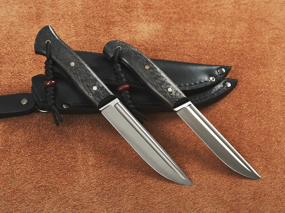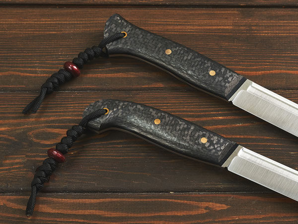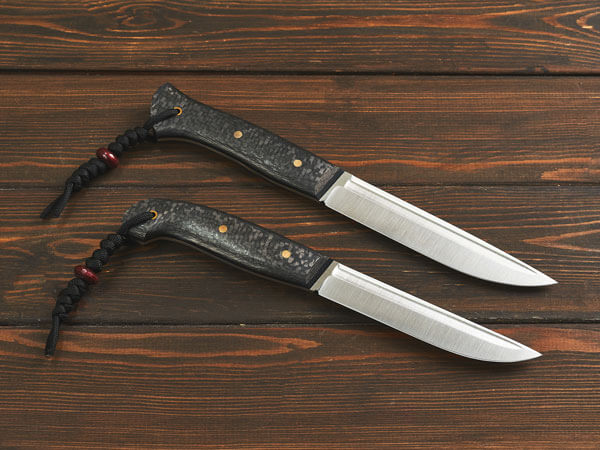 Рукояти ножей изготовлены из карбона – легкого и прочного материала премиум-класса. Он устойчив к коррозии, гниению, воде и запахам, хорошо поглощает вибрацию и не скользит в руке.