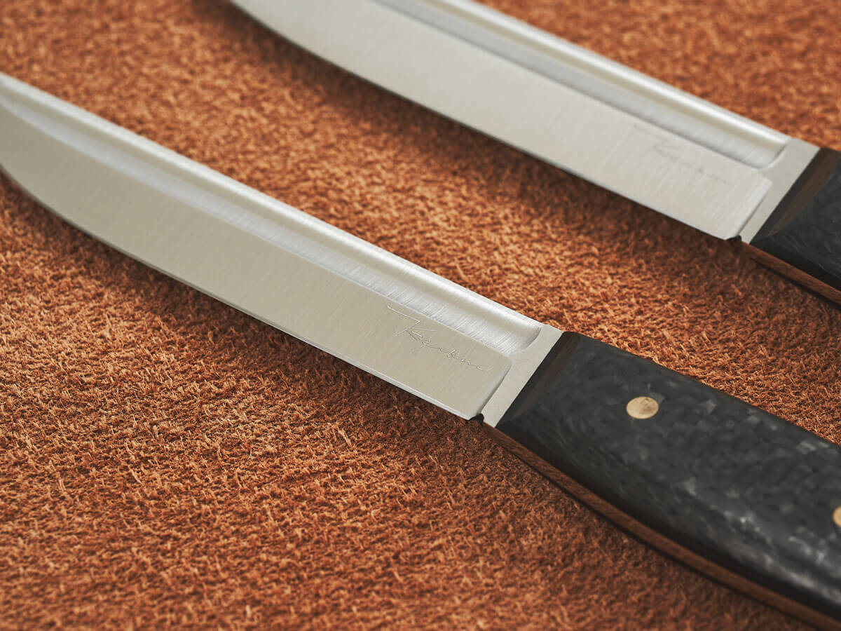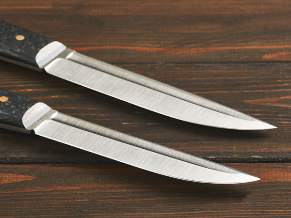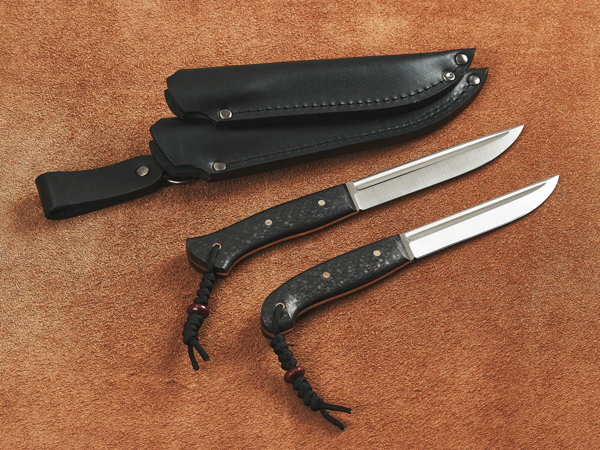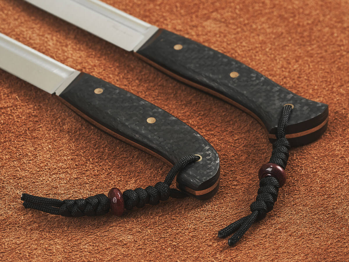 Рукояти ножей изготовлены из карбона – легкого и прочного материала премиум-класса. Он устойчив к коррозии, гниению, воде и запахам, хорошо поглощает вибрацию и не скользит в руке.