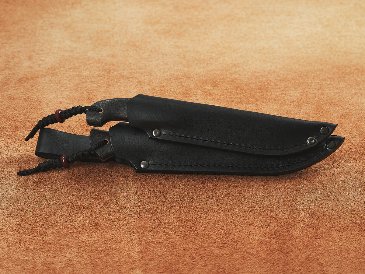 Прилагаемые к изделиям ножны классической формы, сделаны из толстой натуральной кожи и снабжены свободным и фиксированным подвесом. Нож входит в них глубоко, почти до тыльника, клинок сидит плотно и не болтается при тряске. Кожа окрашена в чёрный цвет, аккуратно проклёпана и прошита, хорошо держит форму и приятна на ощупь. Ножны обоих ножей сшиты между собой, образуя единое цельное изделие.
