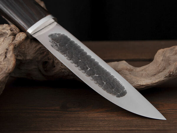 Большой дол на стороне заточки выполнен со следами ковки, что делает нож более аутентичным и брутальным. Якутские мастера традиционно использовали дол, чтобы увеличить жесткость клинка и уменьшить площадь соприкосновения ножа с мясом для более удобной разделки замерзшей туши.