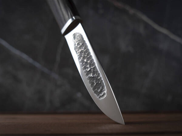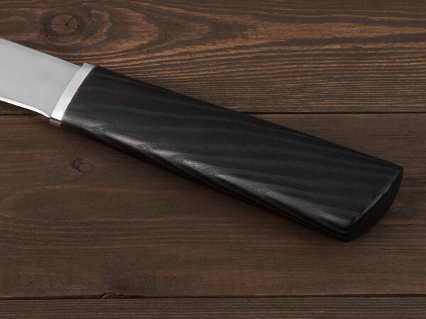 Нож оснащен крепкой рукоятью из черного мореного ясеня – твердого и прочного материала, отличающегося особой долговечностью. Это ценная порода дерева, устойчивая к образованию трещин, кислотам, грибку и плесени.