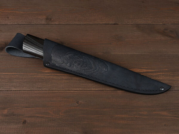 К изделию прилагаются ножны из натуральной кожи с подвесом для ношения на поясе. Нож в таких ножнах плотно упакован, удобен в переноске, не вываливается и не болтается при тряске. Кожа окрашена в черный цвет, аккуратно прошита, хорошо держит форму и приятна на ощупь.