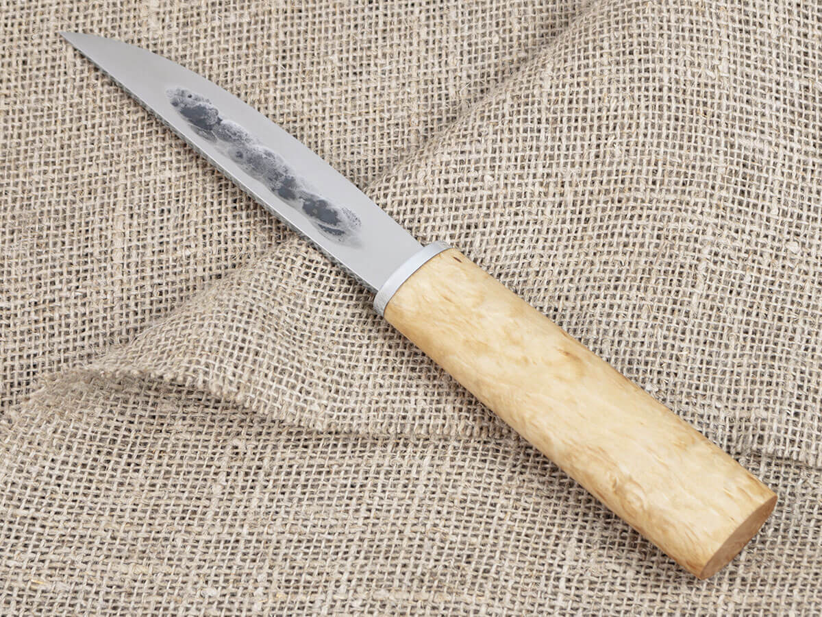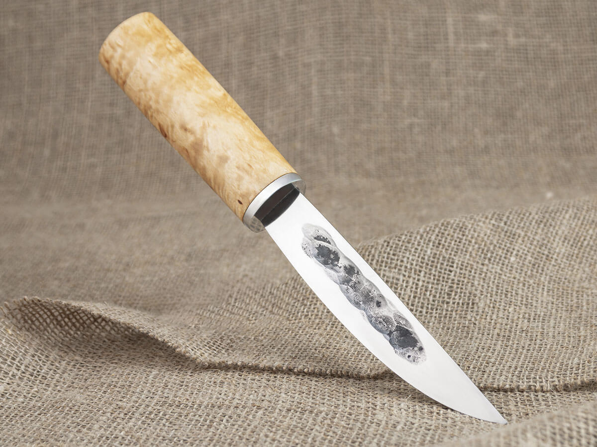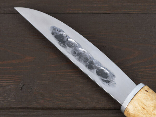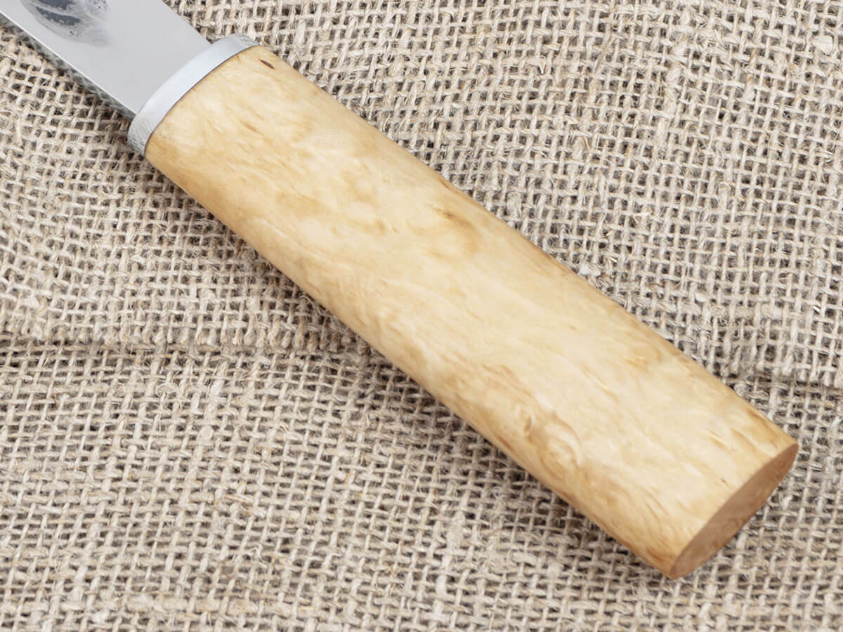 Клинок якутского ножа имеет асимметричный профиль: он заточен только с одной стороны, а на другой имеет выпуклую линзу. Такая форма очень удобна для контролируемого реза: рука легко управляет инструментом и позволяет входить в материал на нужную глубину.