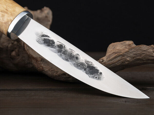Большой дол на стороне заточки выполнен со следами ковки, что делает нож более аутентичным и брутальным. Якутские мастера традиционно использовали дол, чтобы увеличить жесткость клинка и уменьшить площадь соприкосновения ножа с мясом для более удобной разделки замерзшей туши.