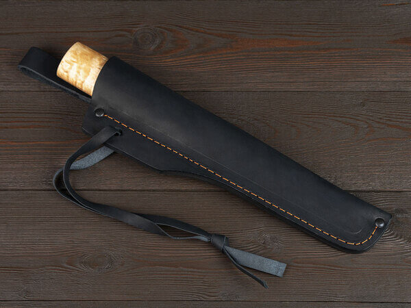 К изделию прилагаются ножны из натуральной кожи с подвесом для ношения на поясе. Нож в таких ножнах плотно упакован, удобен в переноске, не вываливается и не болтается при тряске. Кожа окрашена в черный цвет, аккуратно прошита, хорошо держит форму и приятна на ощупь.