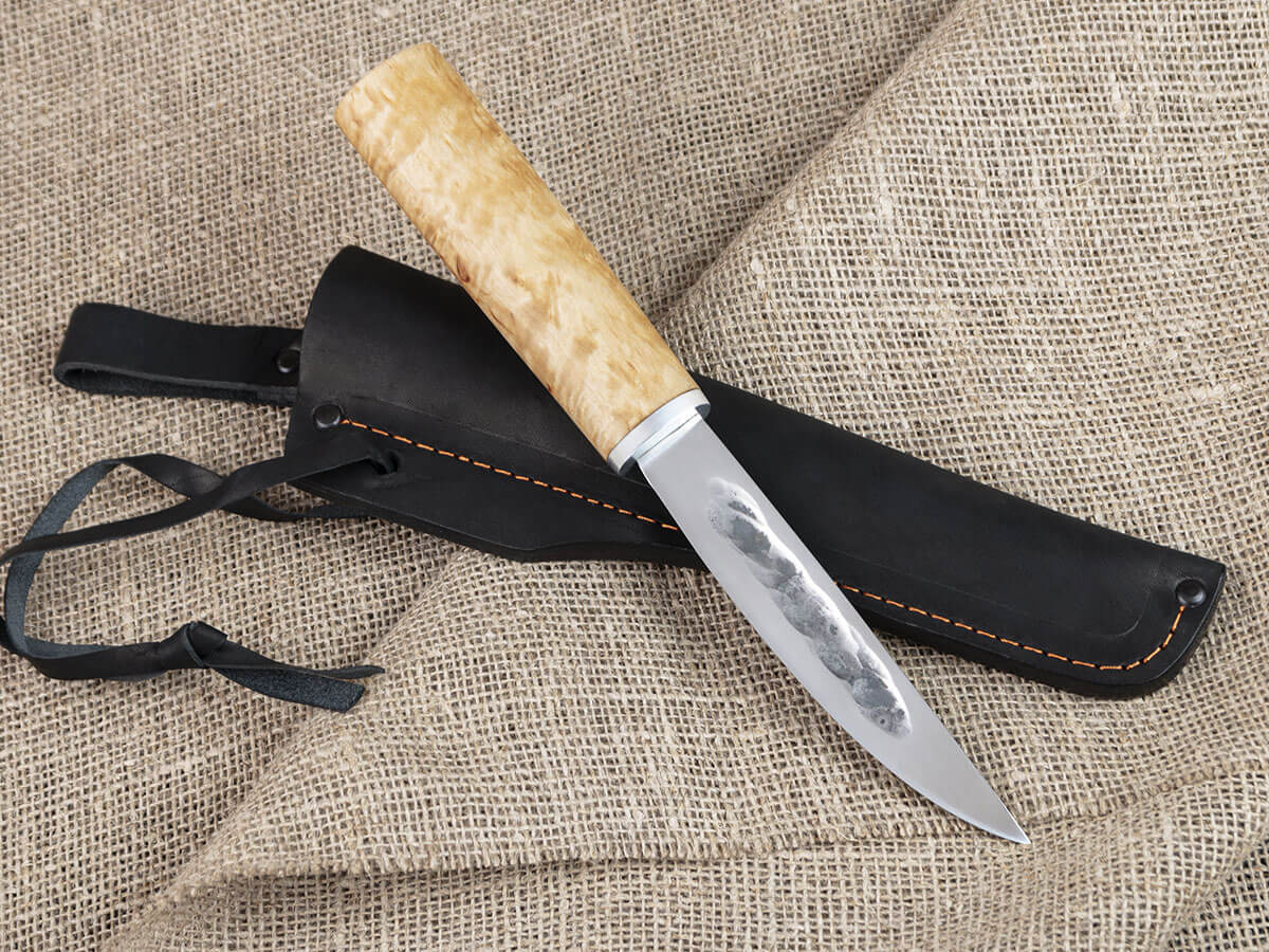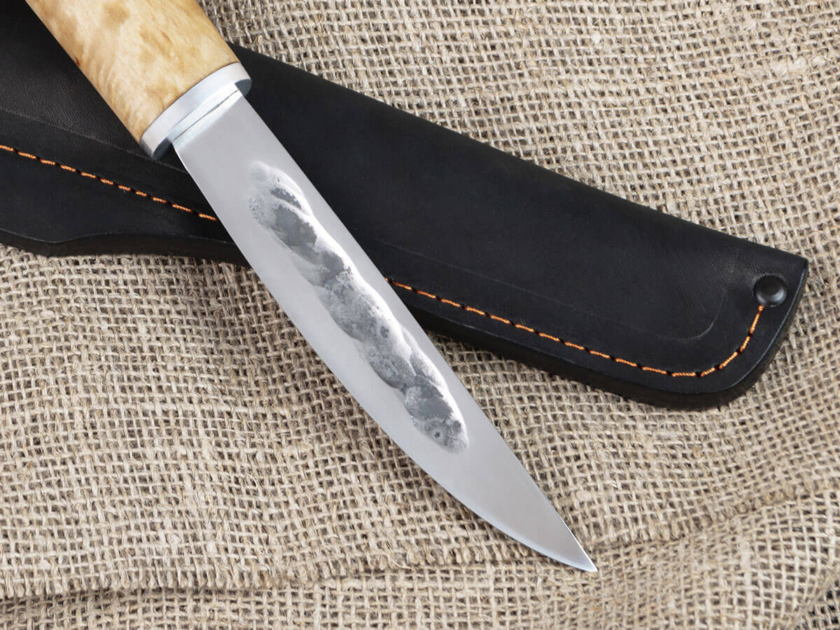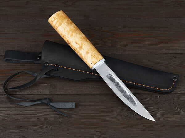 Нож оснащен крепкой рукоятью из карельской березы – красивого прочного материала, который не боится влаги и холода, не рассыхается, не трескается на морозе и умеет удерживать тепло даже при минусовой температуре. Дерево не скользит в мокрой ладони, брать его в руку удобно и приятно.