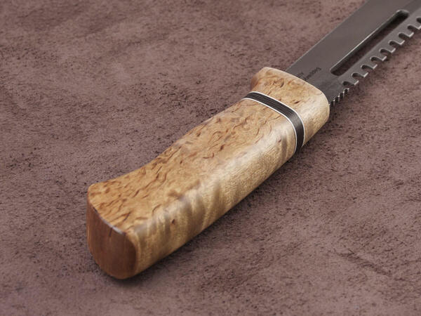 Рукоять изготовлена из цельного куска стабилизированной карельской березы в естественном цвете. Этот красивый и прочный материал не боится влаги, не скользит в мокрой ладони, не рассыхается, не трескается на морозе и удерживает тепло даже при минусовой температуре.